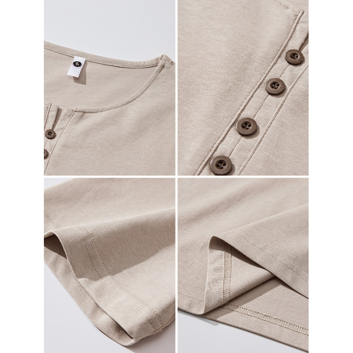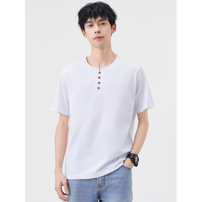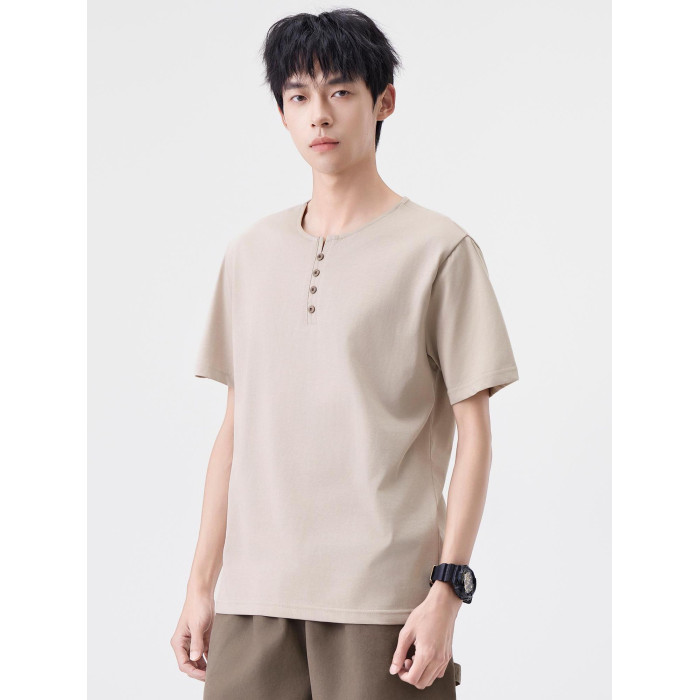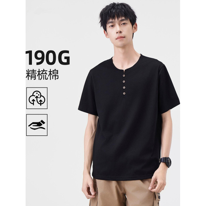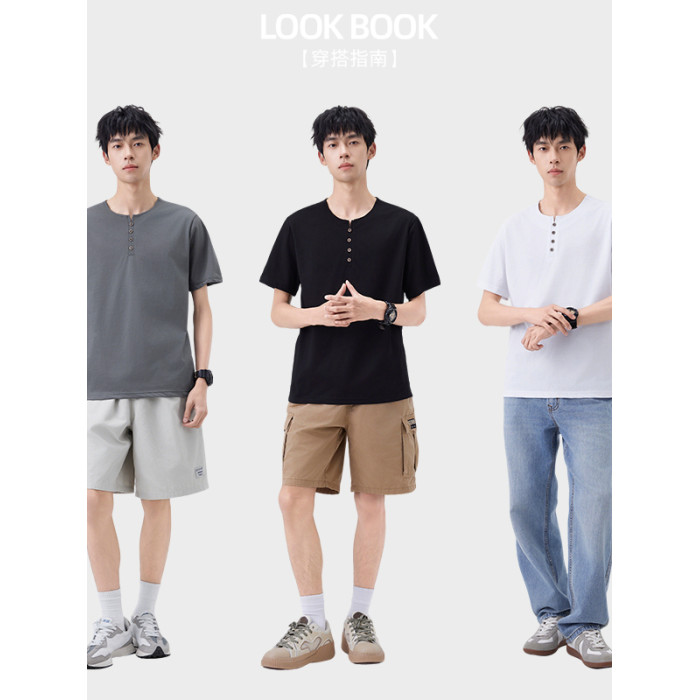 日系亨利領純色男士短袖T恤夏季新款冰感透氣時尚寬松運動風體恤