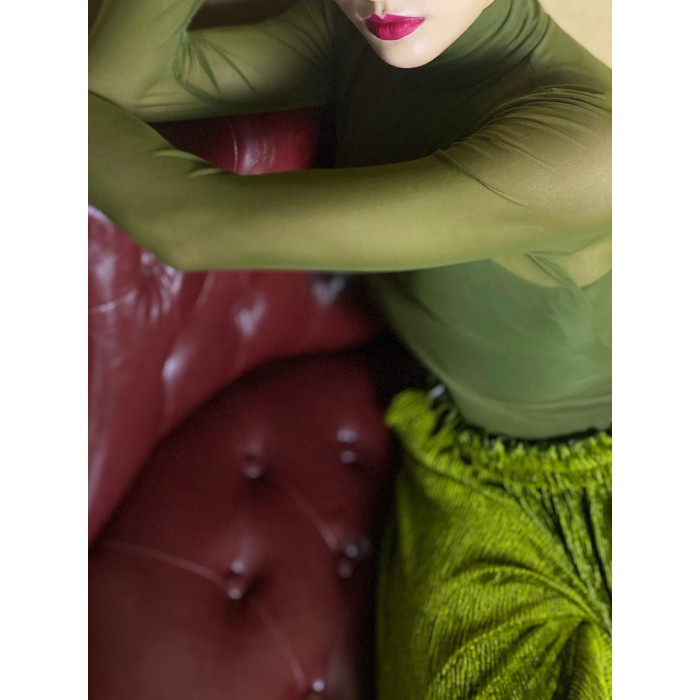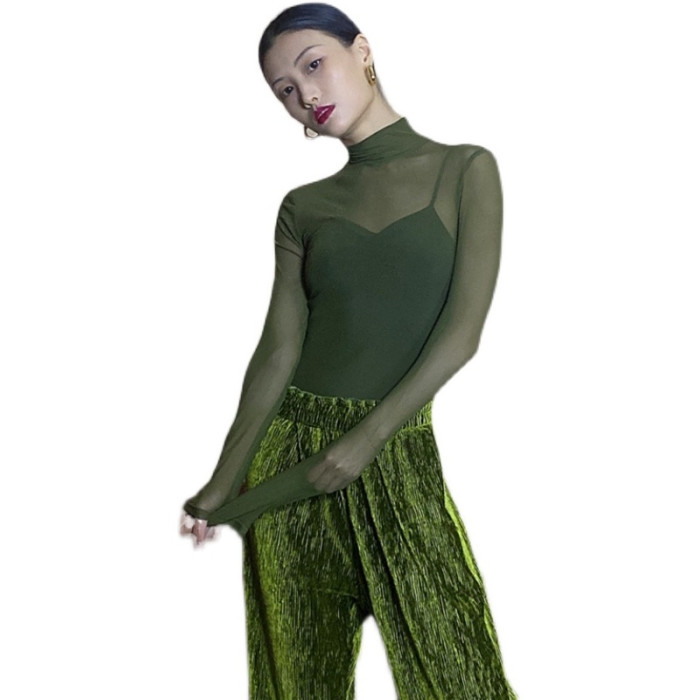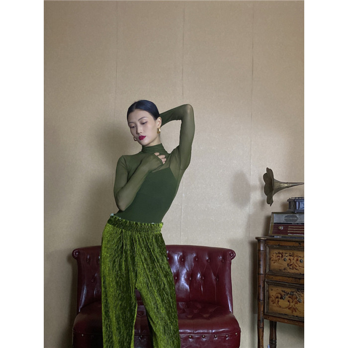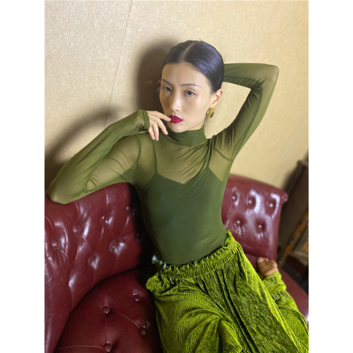 WYZ蓋蓋新品美麗網紗連體衣軍綠色氣質高領修身純色性感網紗衣