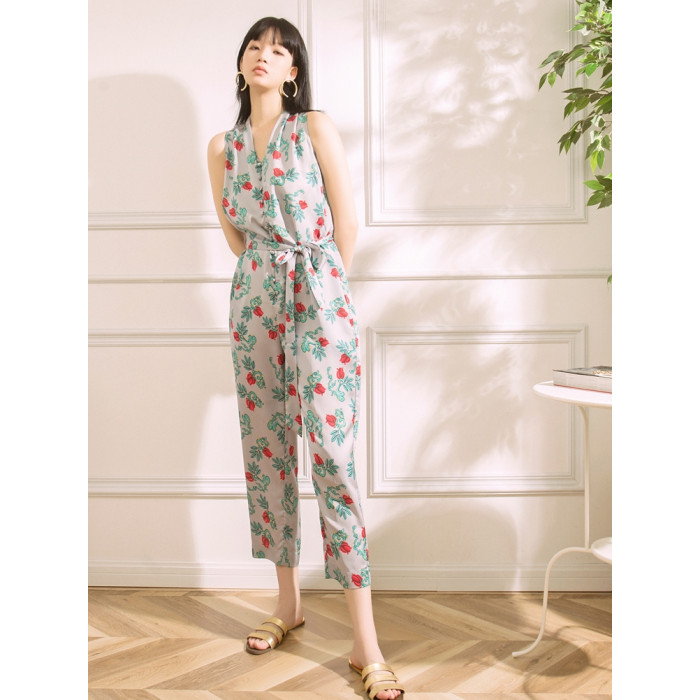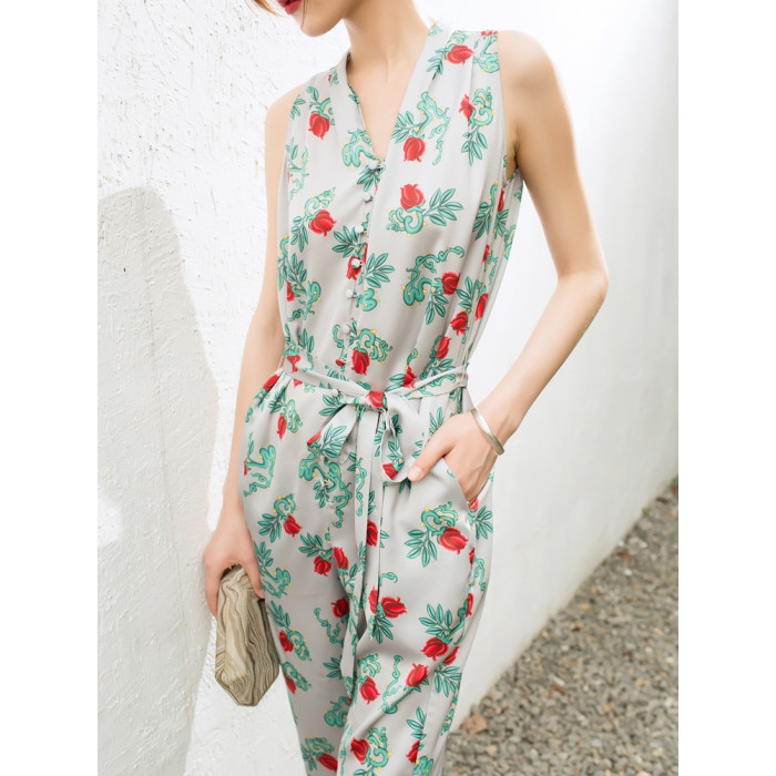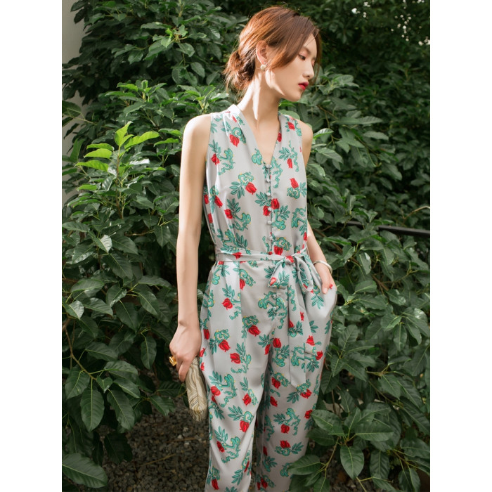新款無袖吊帶連體衣氣質雪紡連身褲碎花顯瘦連體褲女夏濶腿褲