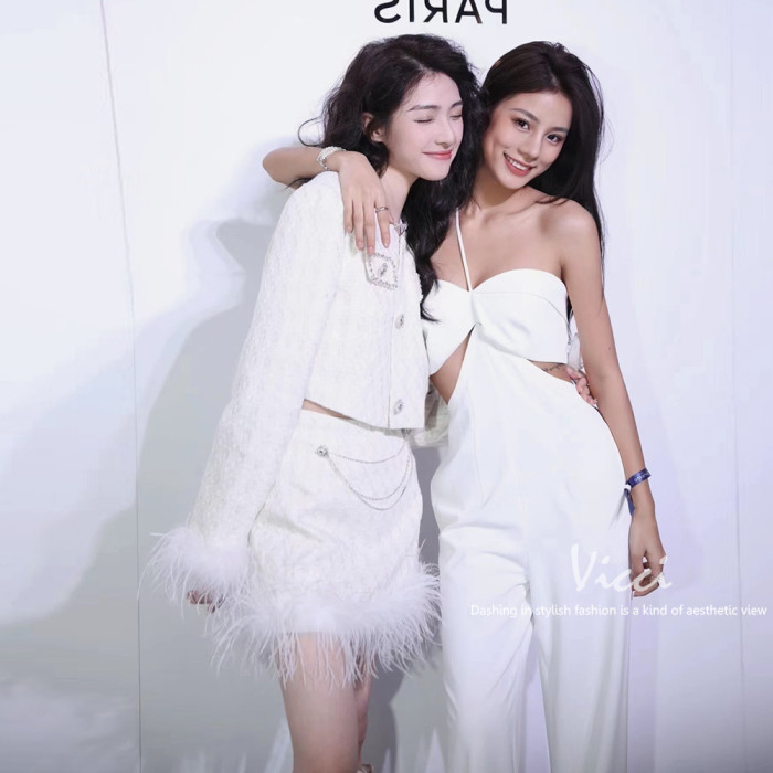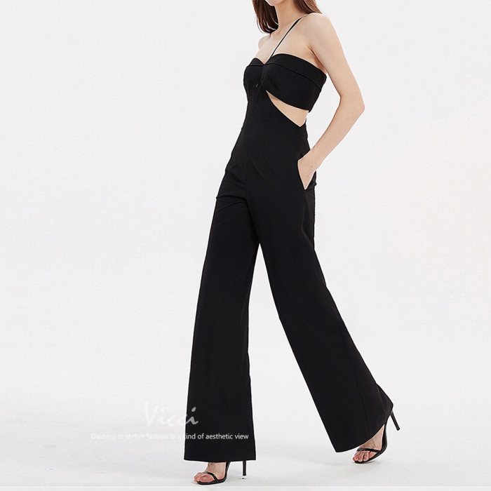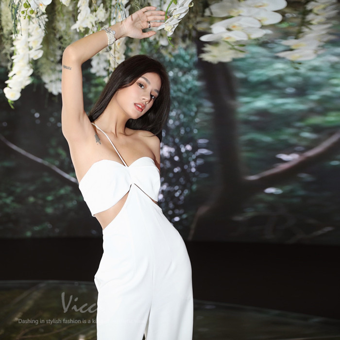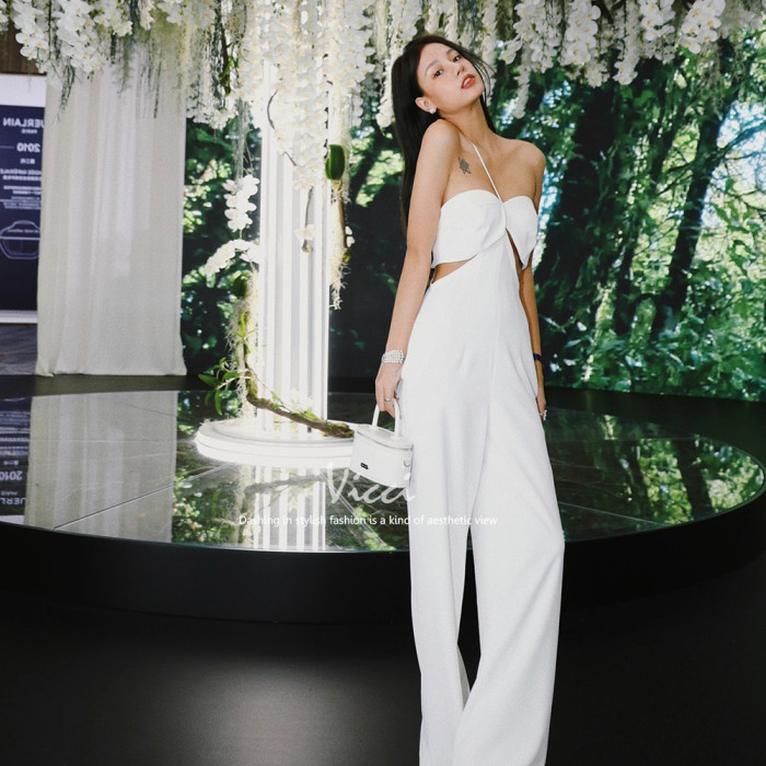泰國潮牌白色吊帶單肩抹胸連體褲初春設計感高腰連體衣長款濶腿褲