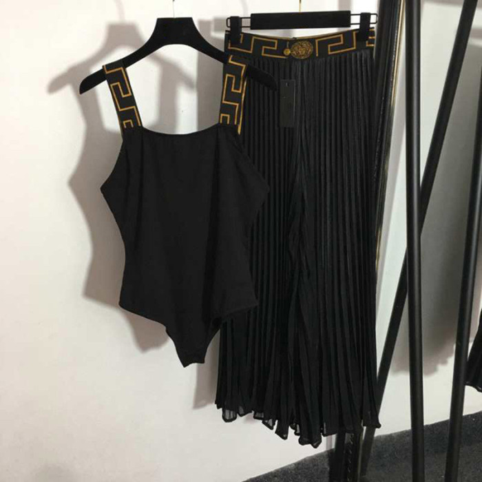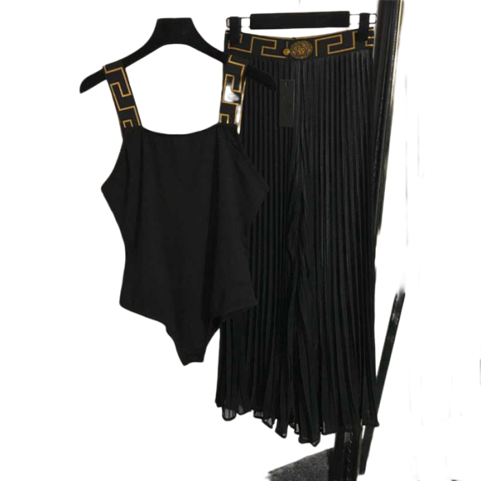 歐洲站時尚潮牌性感辣妹吊帶背心連體衣濶腿百褶裙褲套裝女休閒夏