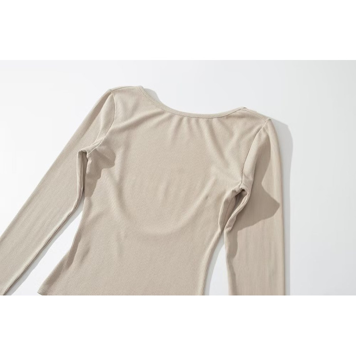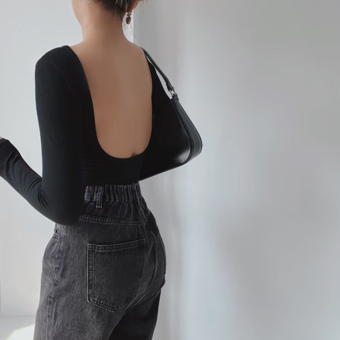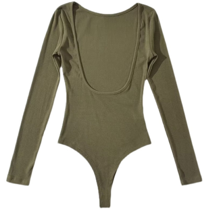 性感大露背一字領連體衣女秋季新款外穿百搭長袖打底上衣連身T恤