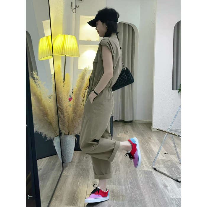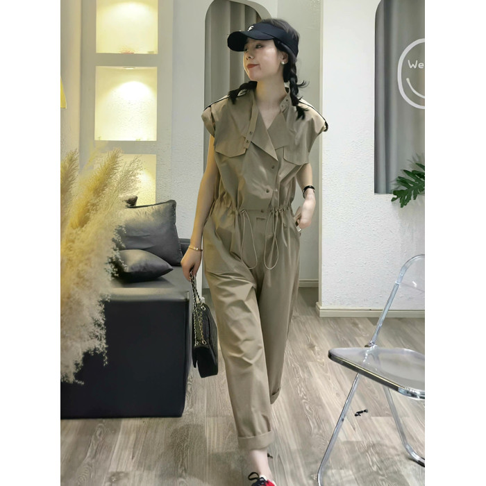 韓版時尚工裝連體褲女2025年夏季新款抽繩收腰休閒純色短袖連體衣