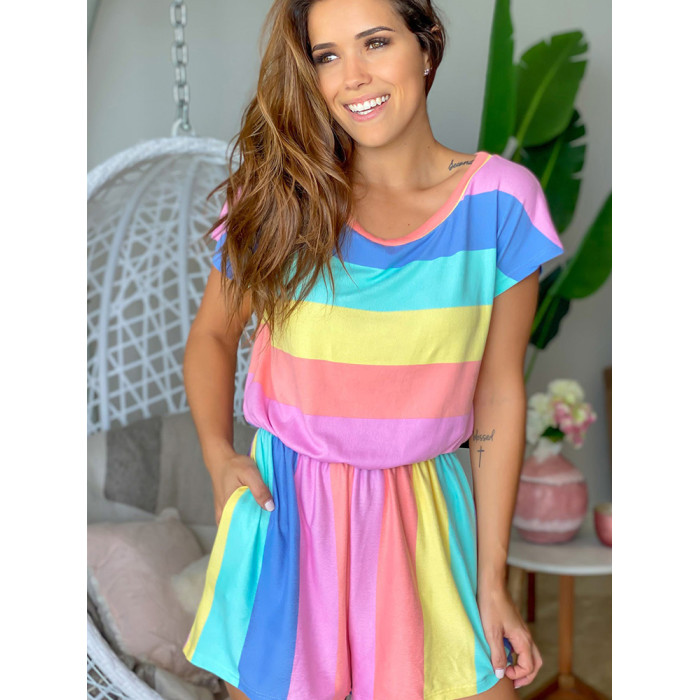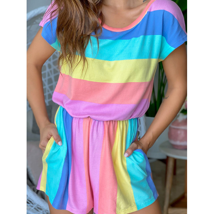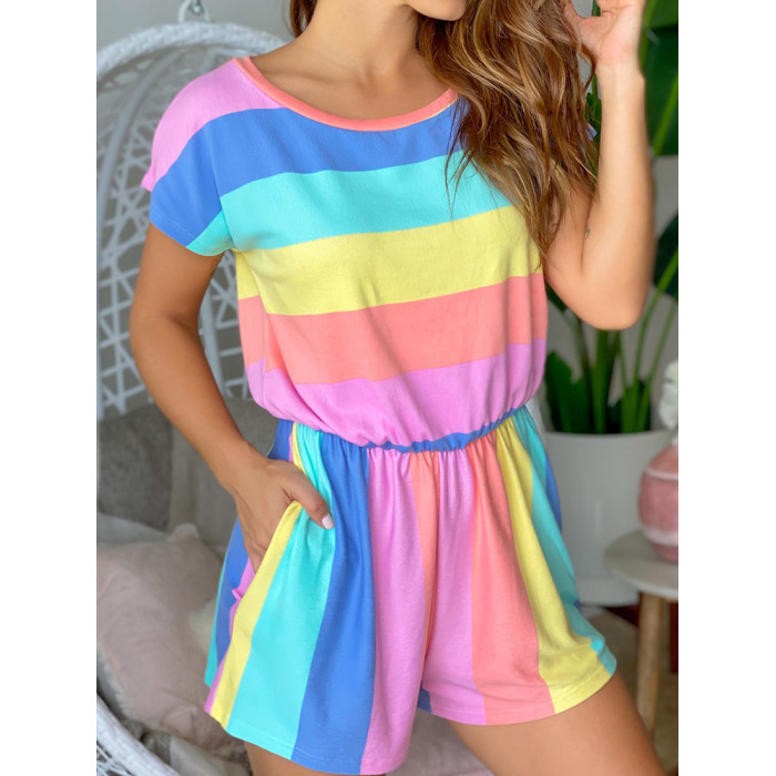 2025夏季新款條紋撞色短袖連體衣女歐美薄款百搭松緊腰口袋連體褲