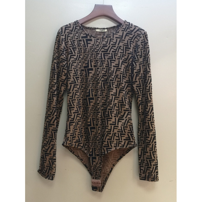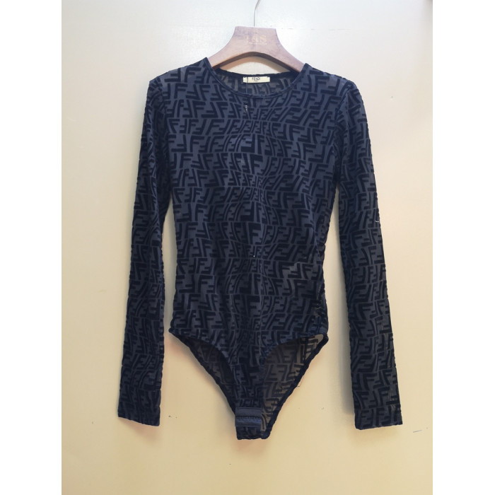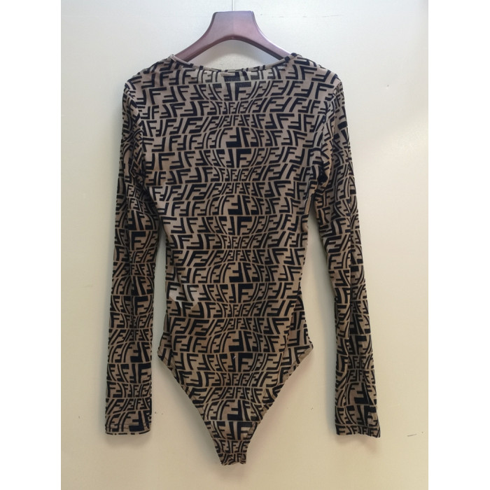 歐美經典字母老花微透網紗圓領長袖連體衣2023年緊身百搭打底衫女