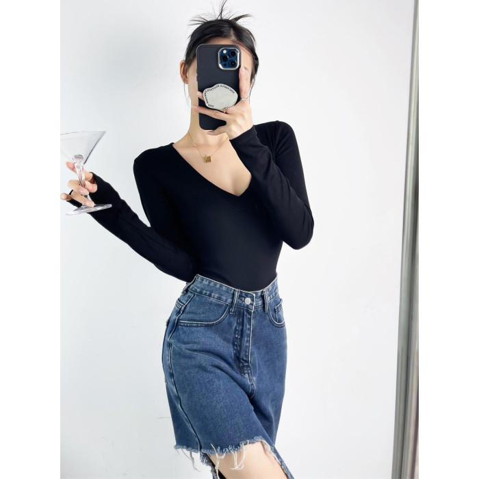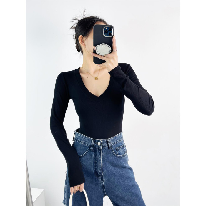 春秋款歐美辣妹上衣低V領長袖螺紋棉打底連體衣修身顯瘦百搭T恤女