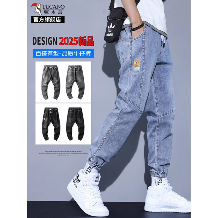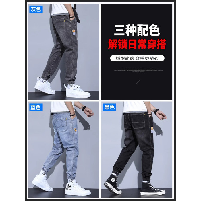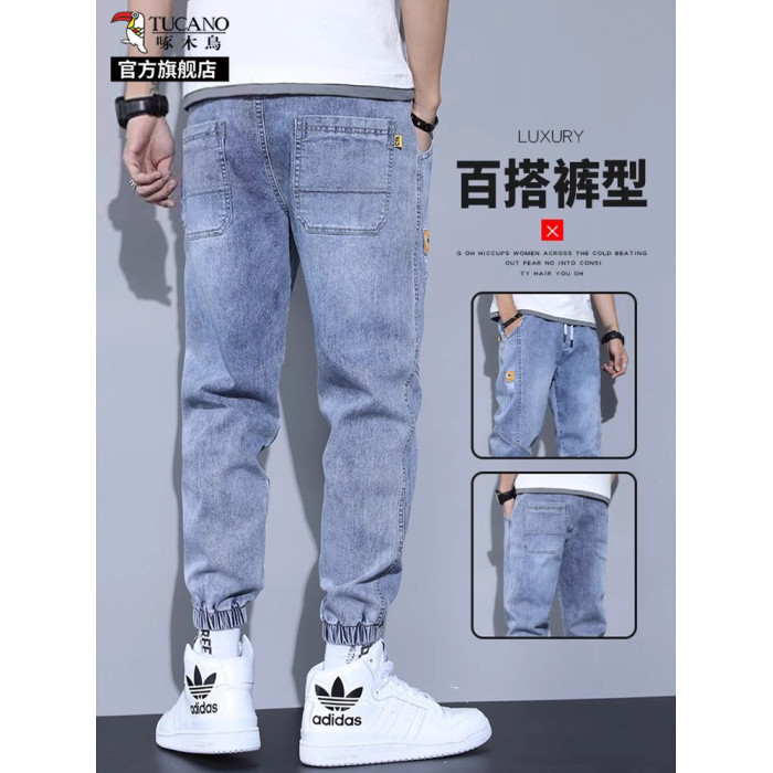 啄木鳥工裝牛仔褲男款夏季薄款潮牌寬松哈倫褲束腳休閒九分褲子K