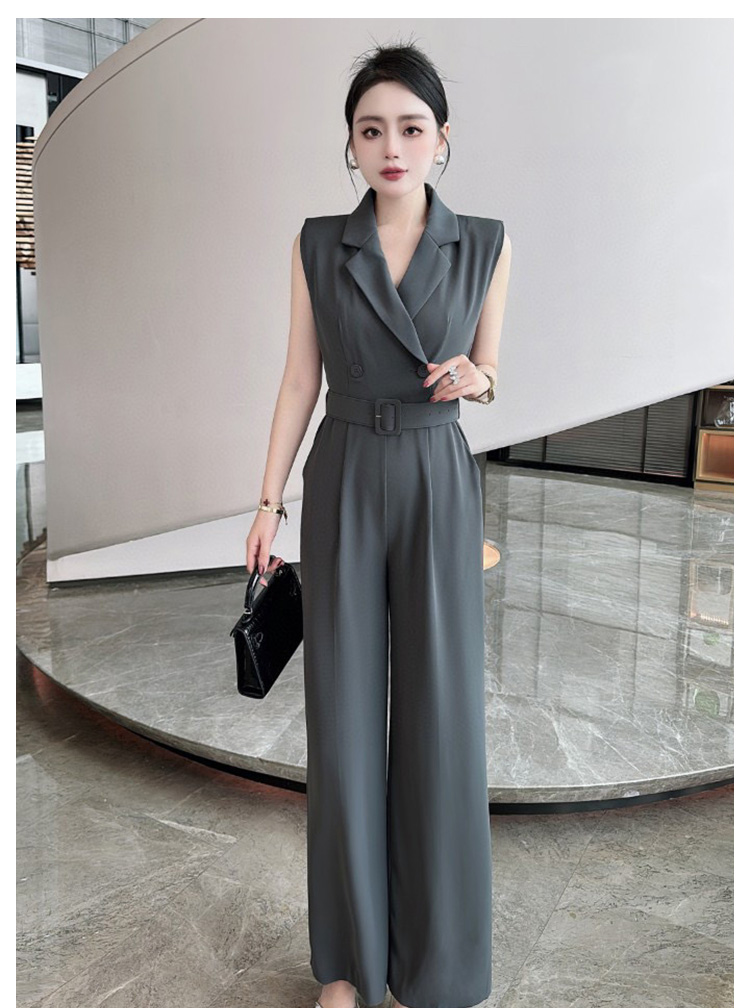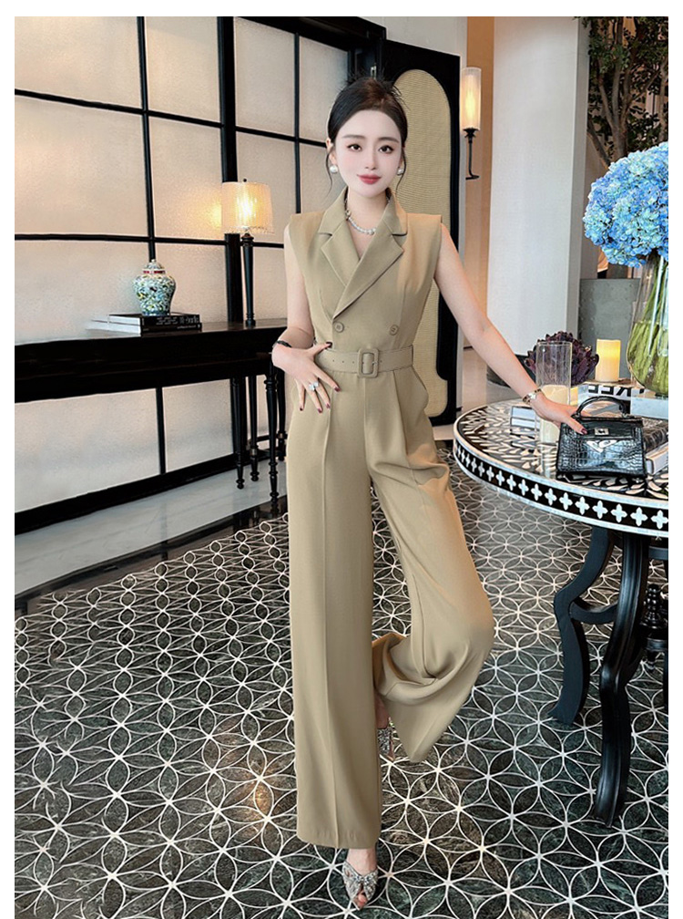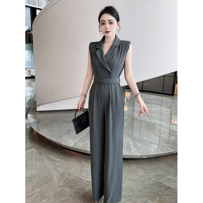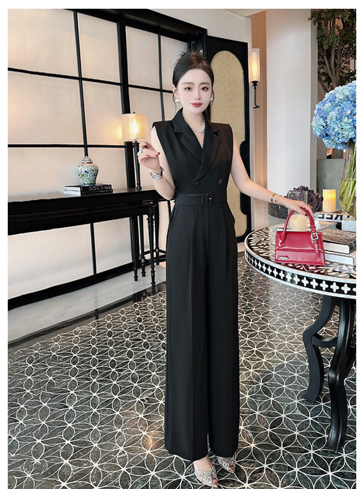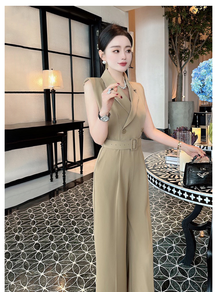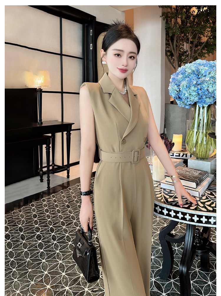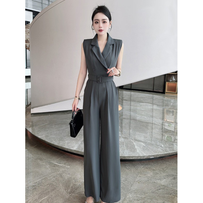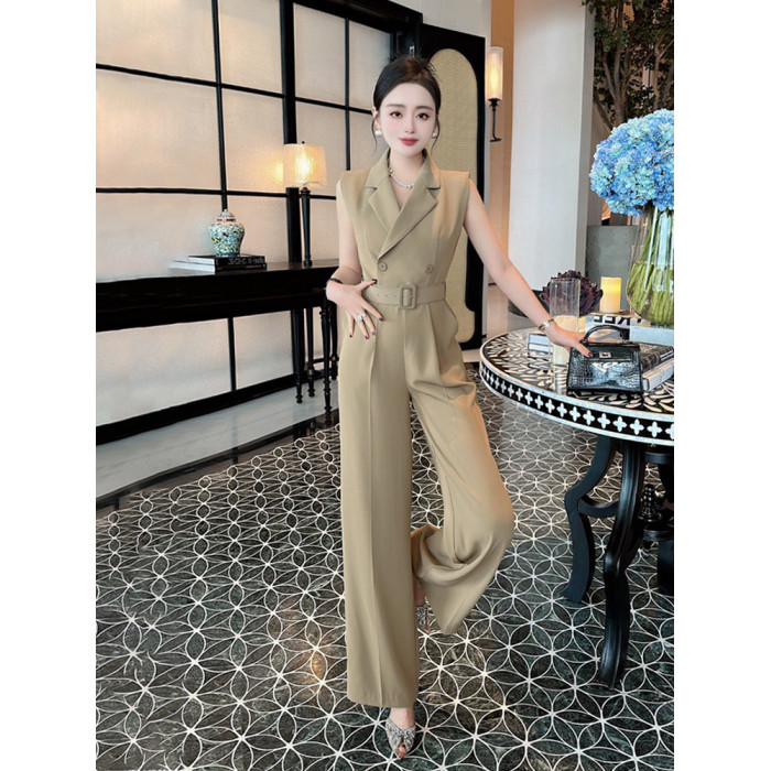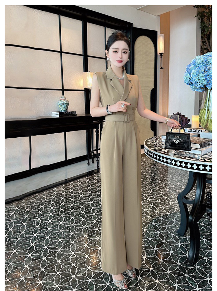 2025春夏新款減齡時尚收腰無袖西裝連體衣女濶腿連體褲職業套裝