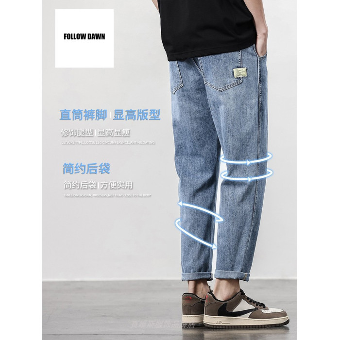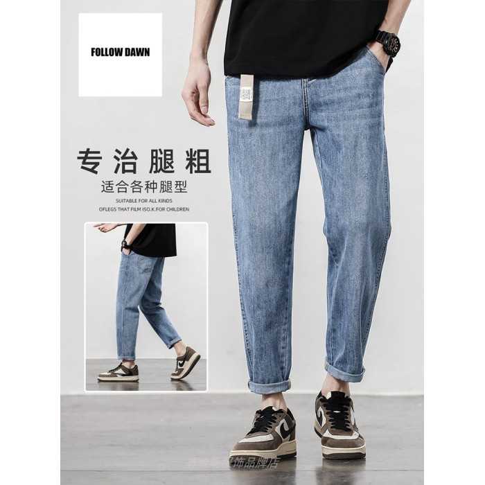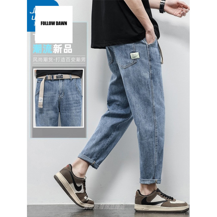 2025春秋新款淺藍色牛仔褲子寬松直筒微錐形百搭男士哈倫休閒褲子