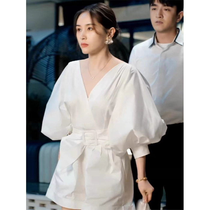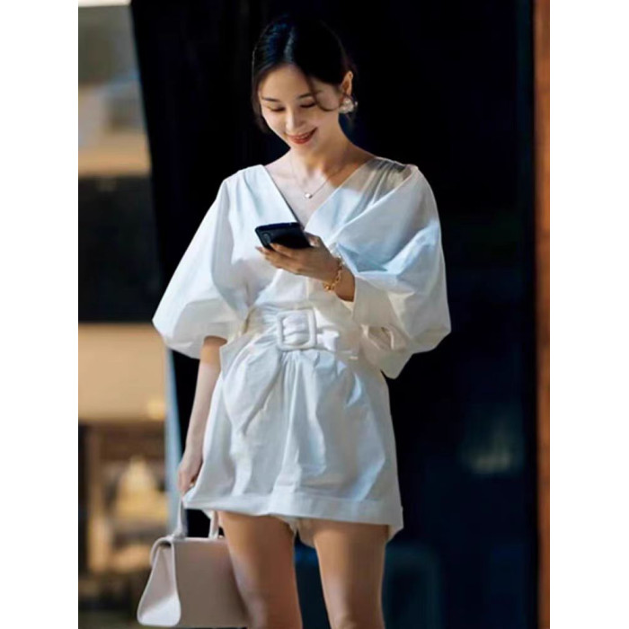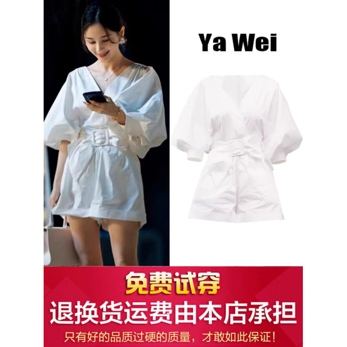 王子文明星同款白色V領泡泡袖連體褲女夏法式收腰濶腿短褲連體衣