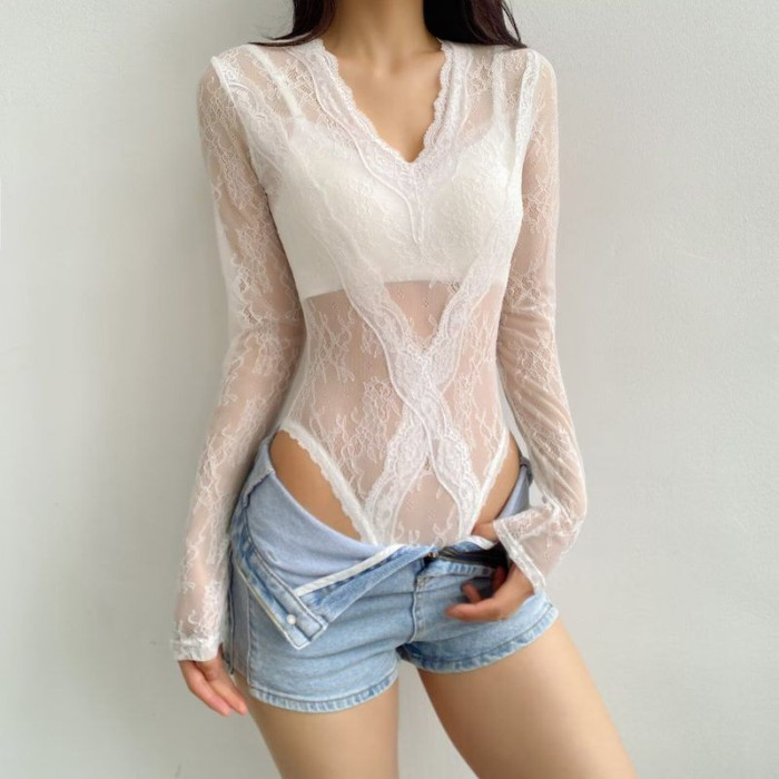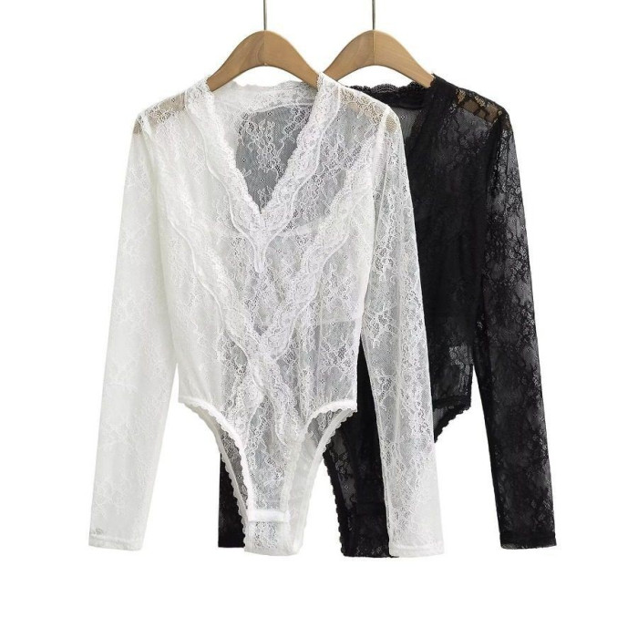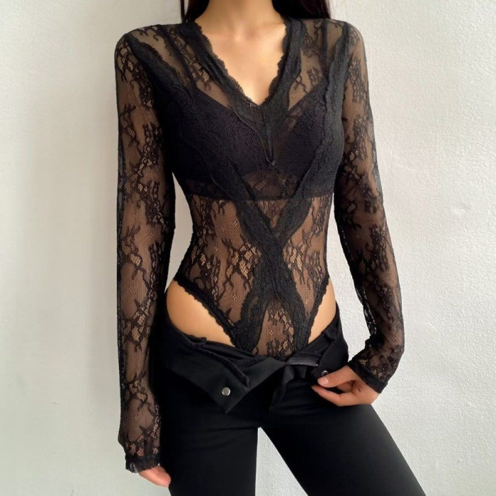 highheels舞服性感辣妹V領蕾絲透視爵士jazz長袖修身連體衣上衣