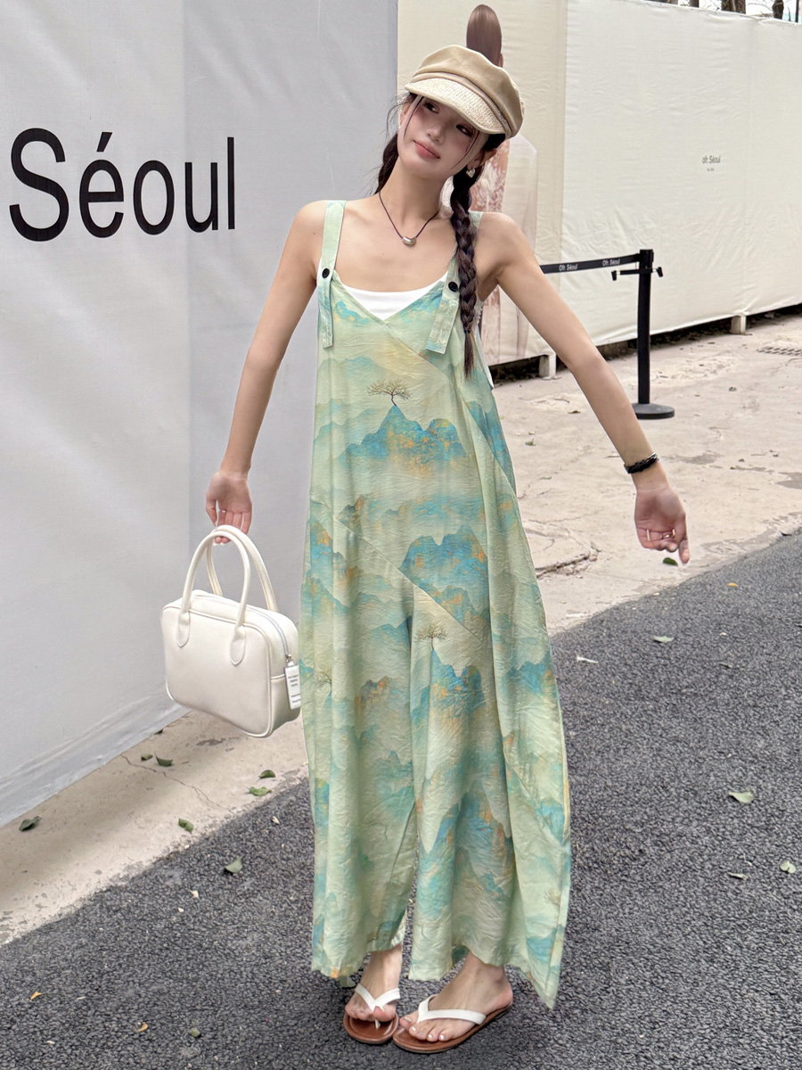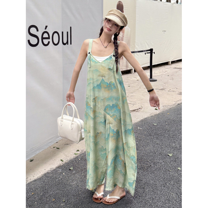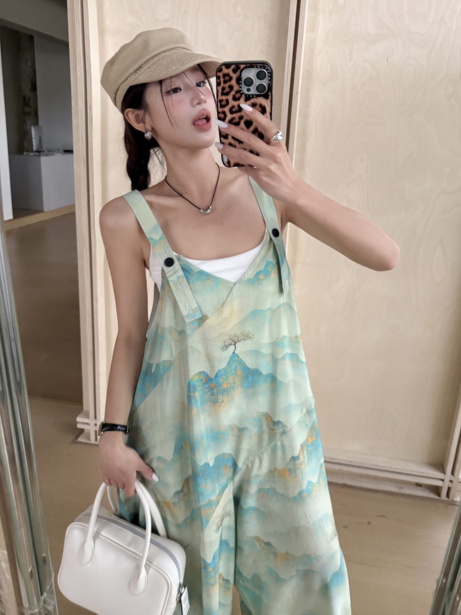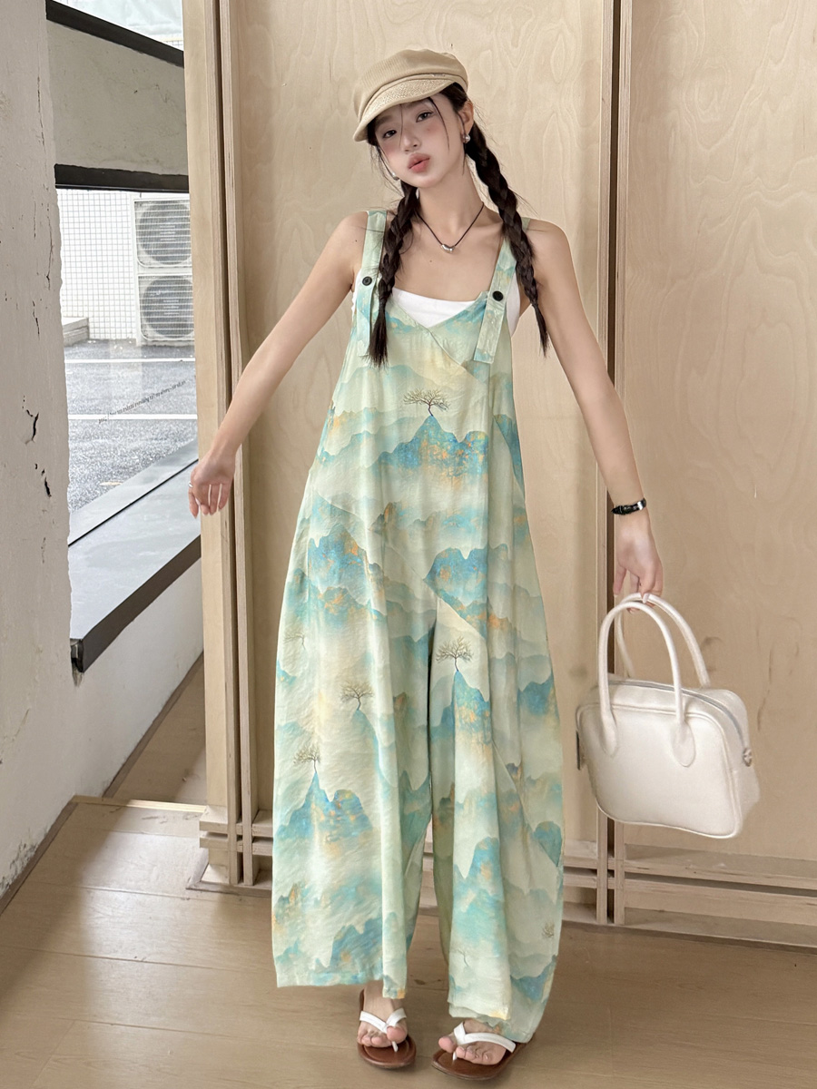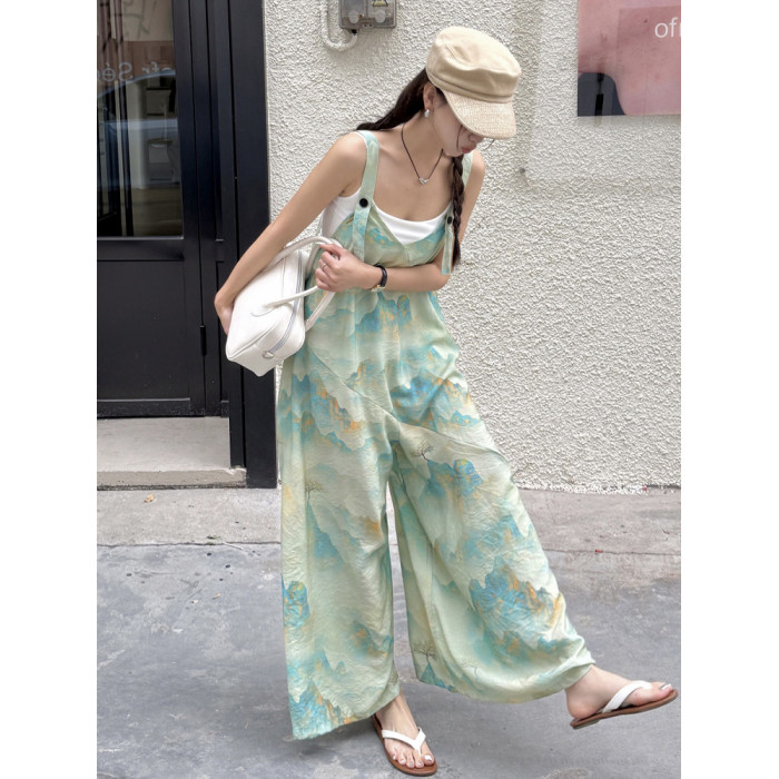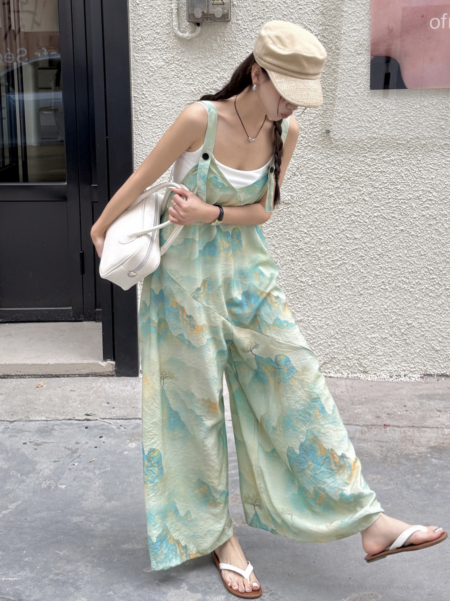 時髦復古國風印花背帶褲女夏新款寬松百搭濶腿褲新中式吊帶連體衣