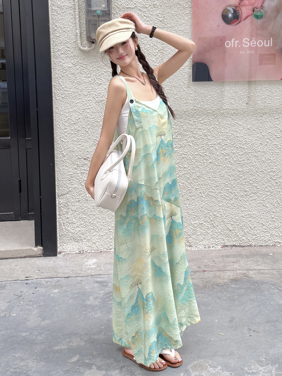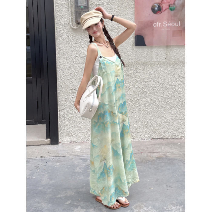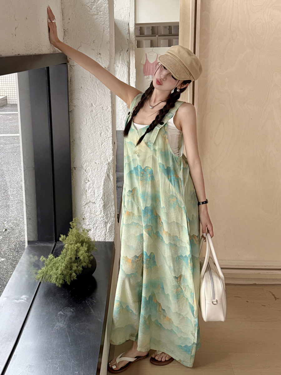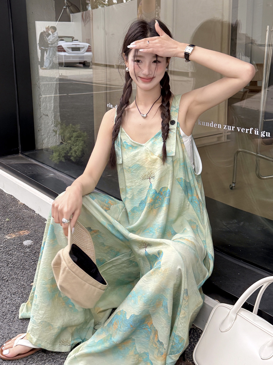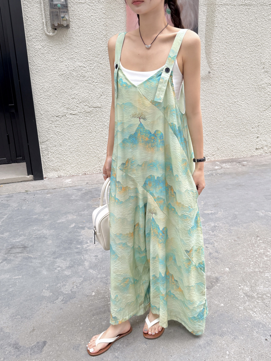 時髦復古國風印花背帶褲女夏新款寬松百搭濶腿褲新中式吊帶連體衣