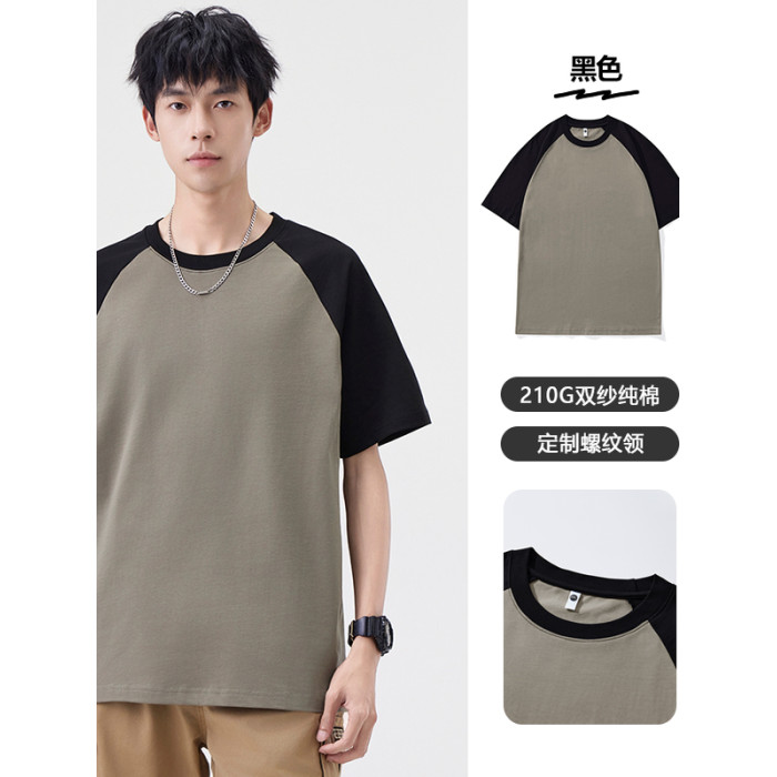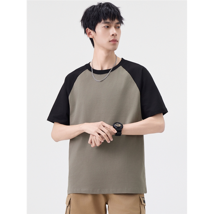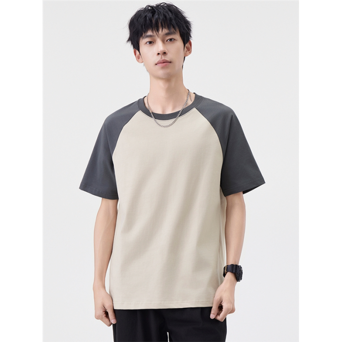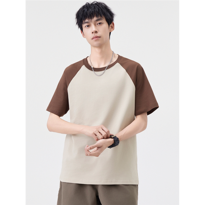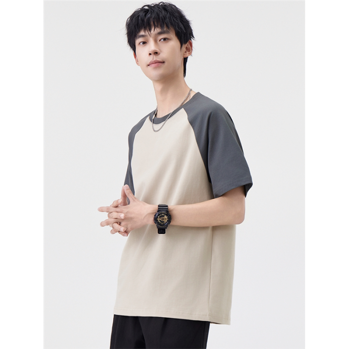 2025夏季雙紗面料短袖T恤男美式高街拼接撞色寬松休閒圓領上衣
