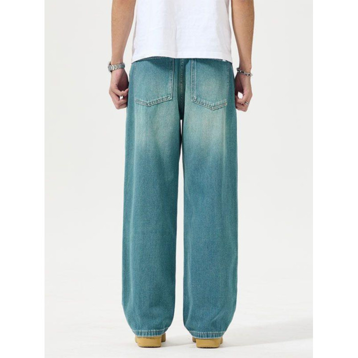 寬松直筒牛仔褲男2025春夏季新款美式潮牌孔雀藍彈力休閒濶腿褲子