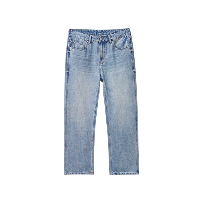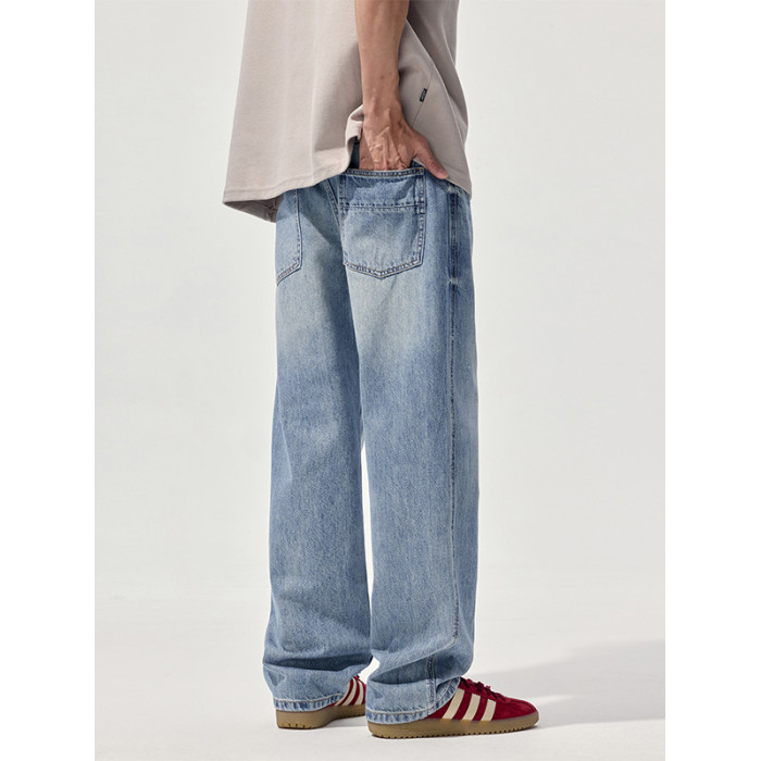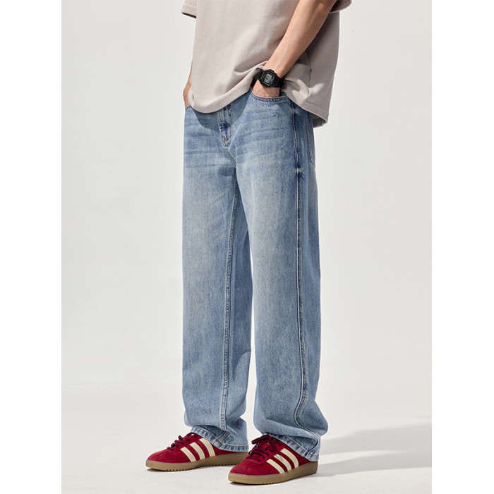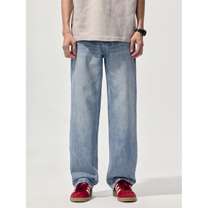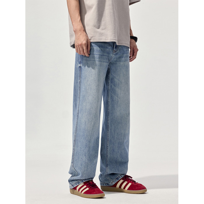 2025春夏新款寬松薄款休閒美式高街潮牌直筒濶腿牛仔褲淺藍色水洗