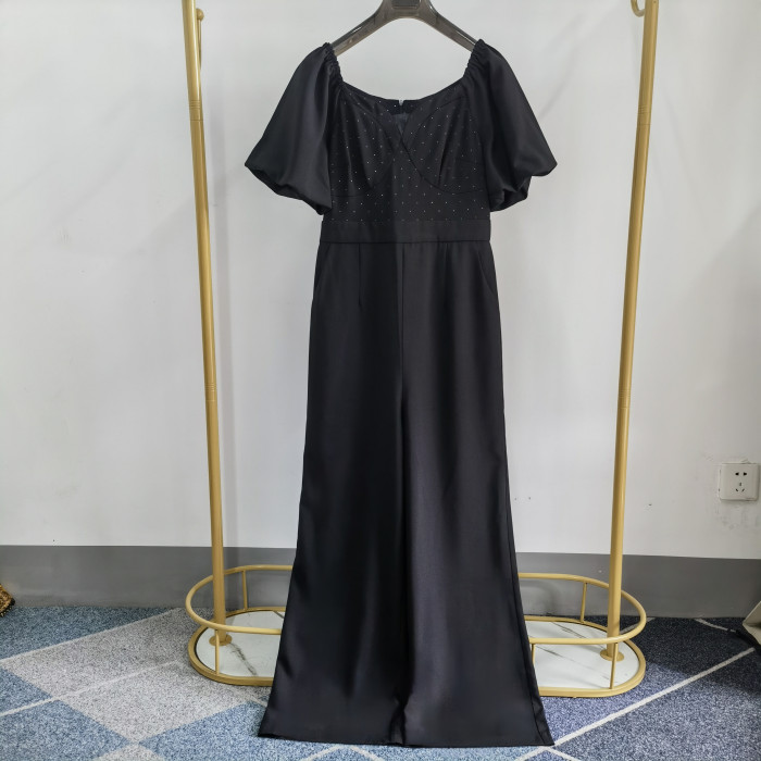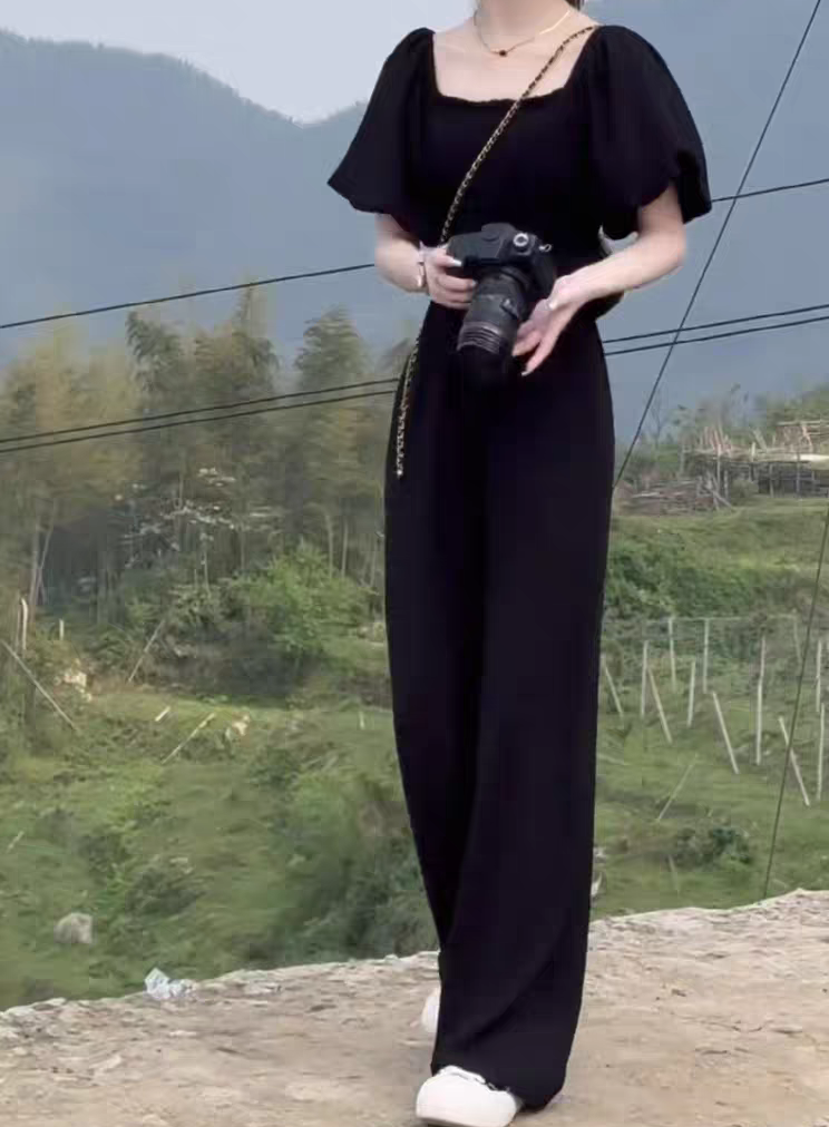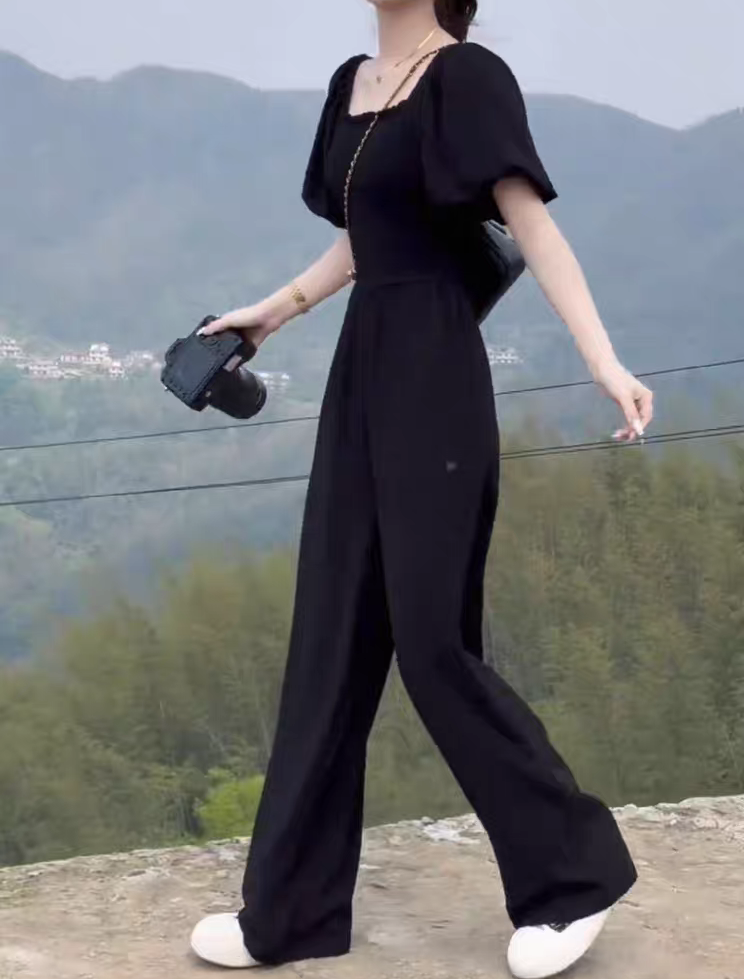 velwin蔚雯泡泡袖方領連體褲女夏新款顯瘦垂感濶腿褲高級感連體衣