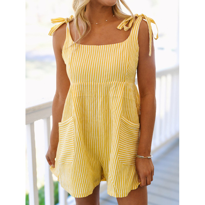 夏季薄款吊帶方領無袖連體衣女2025歐美寬松休閒條紋撞色連衣短褲