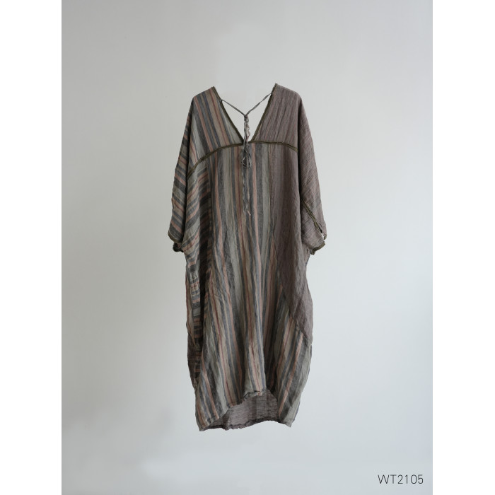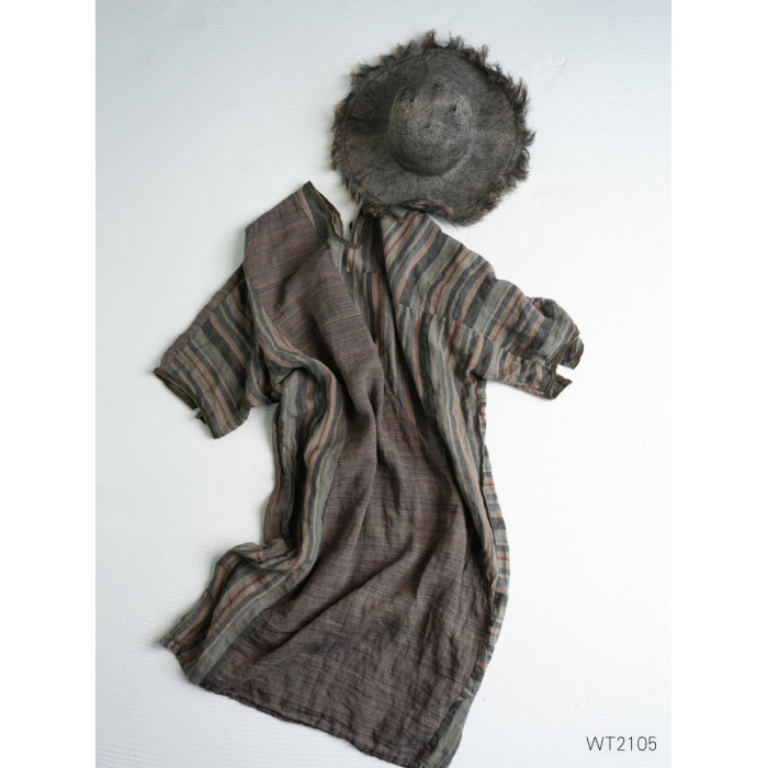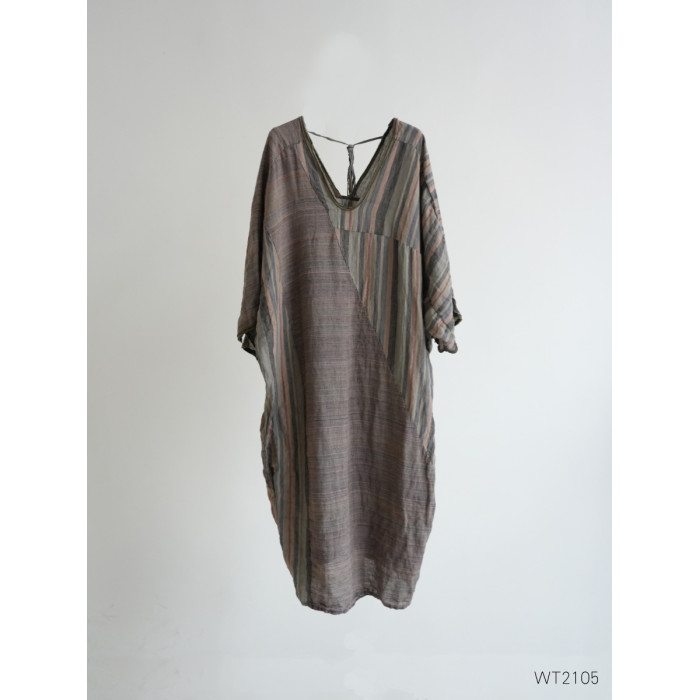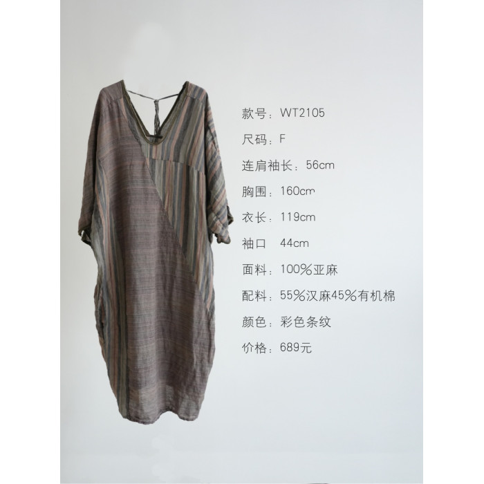 幾見 原創設計春夏亞麻條紋連衣裙袍子復古拼接連體衣禪意WT2105