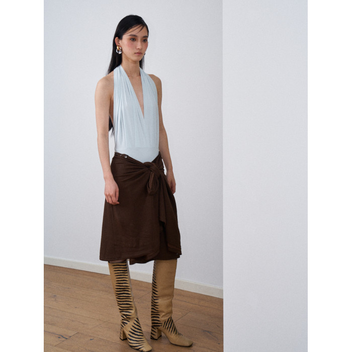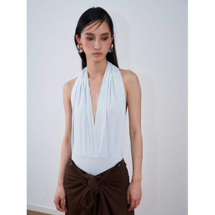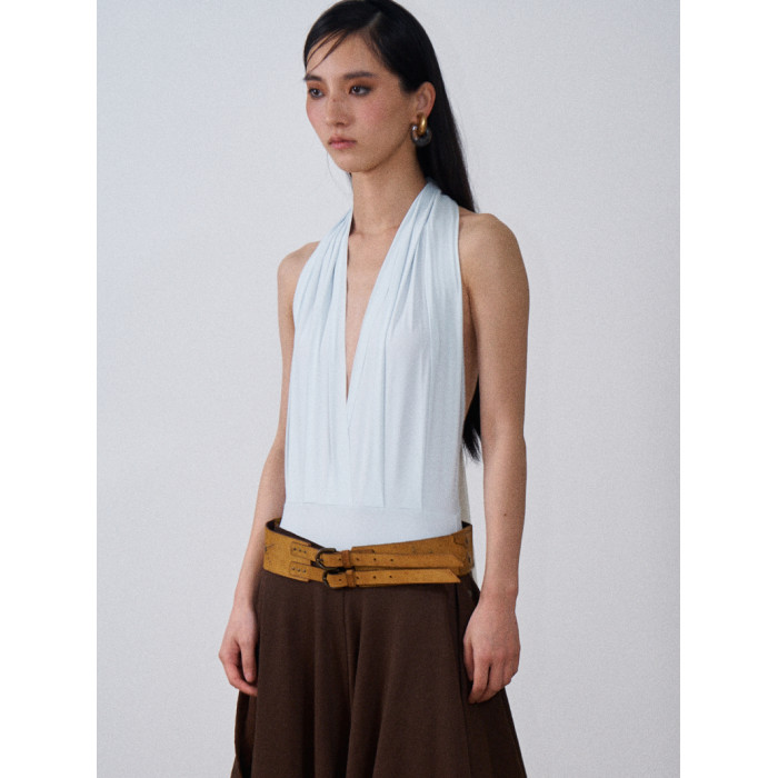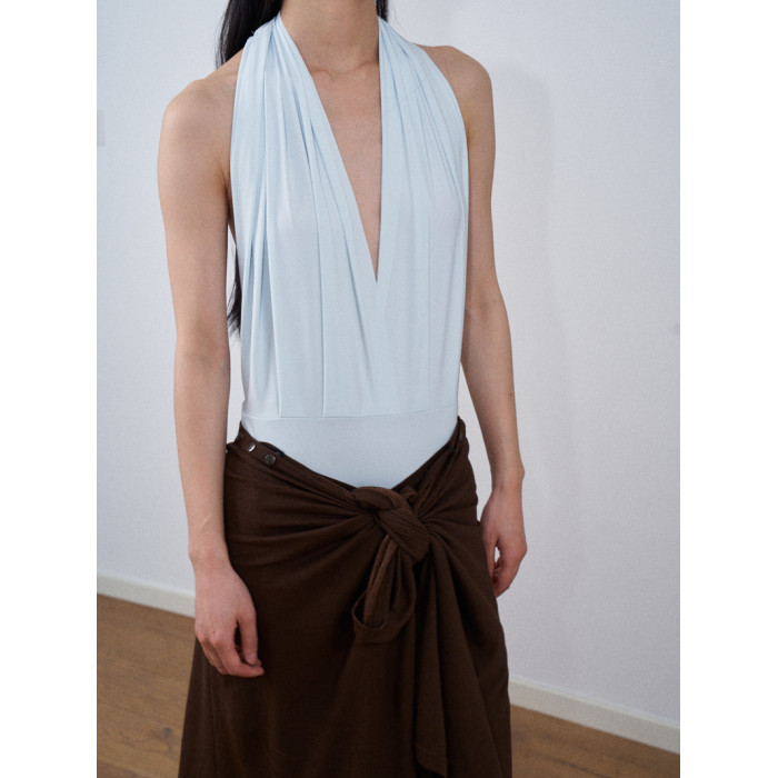 ENK 淡藍色彈力系帶長絲巾版露背掛脖連體衣
