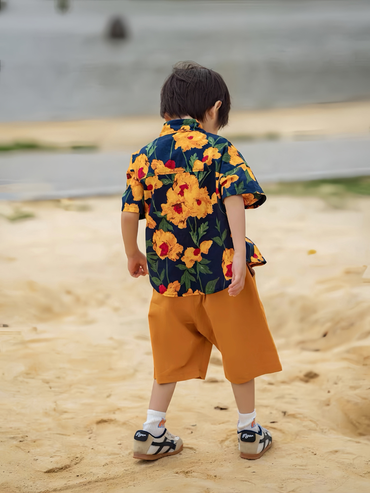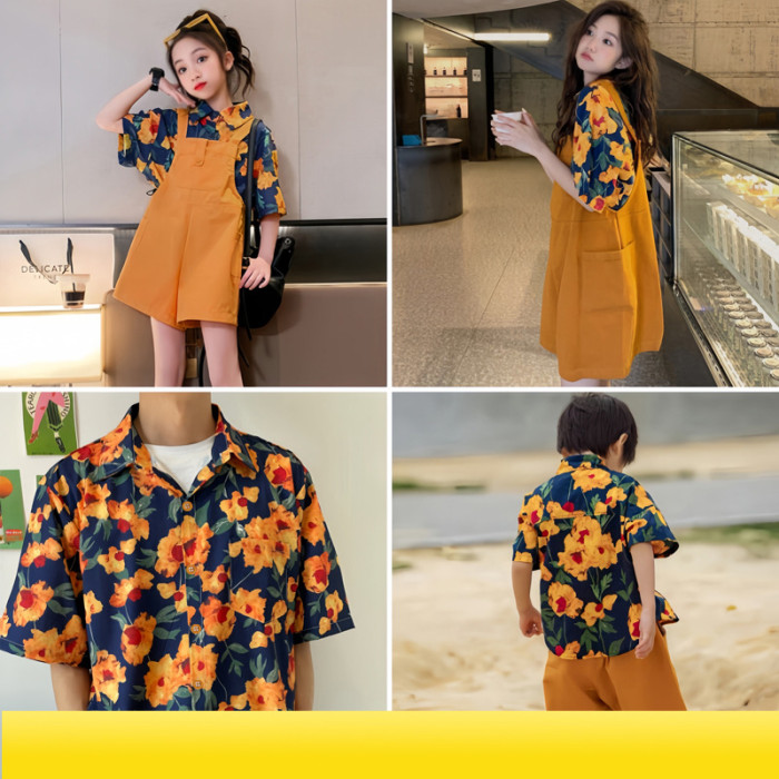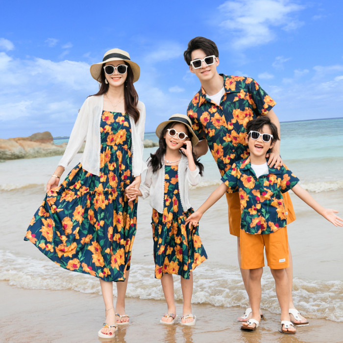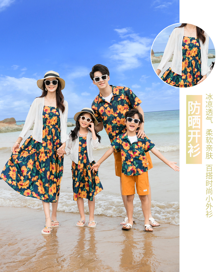 不一樣親子裝夏裝新款港風復古一家三口四碎花襯衫沙灘母女背帶褲