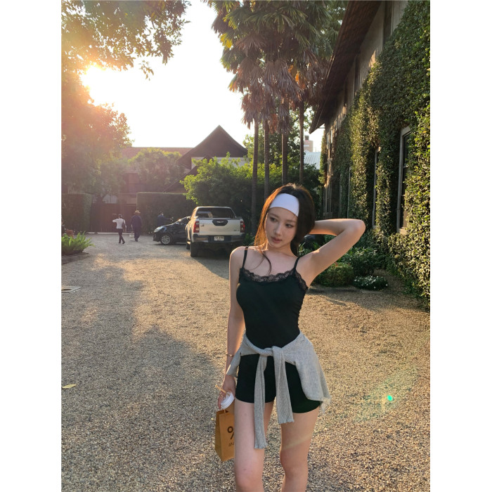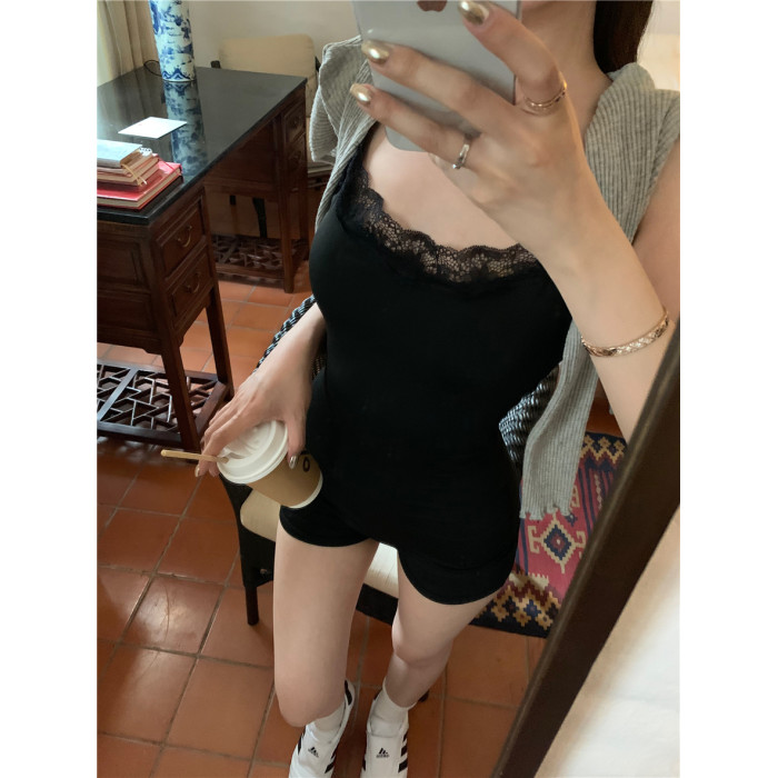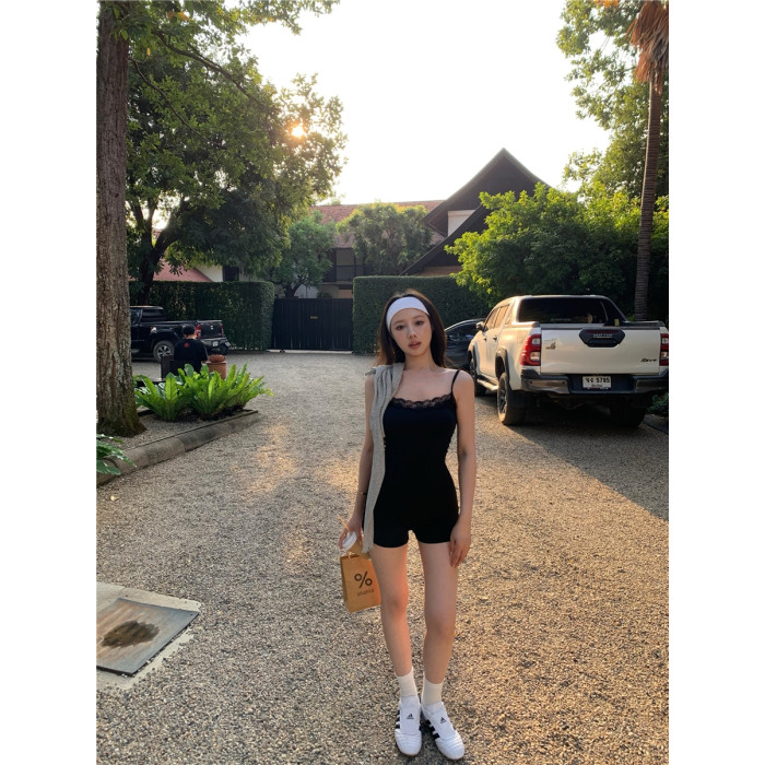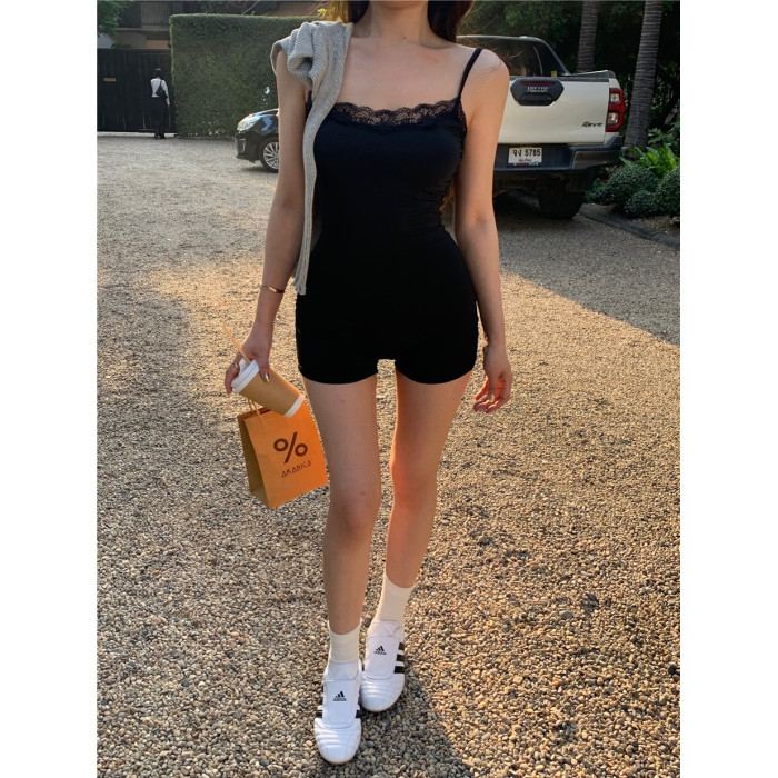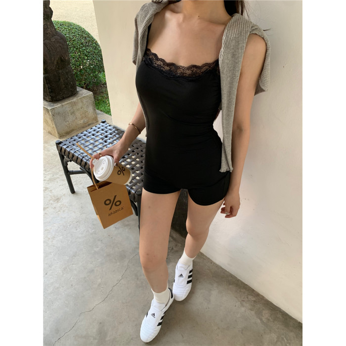 Buttetfly effect新錢風黑色吊帶蕾絲連體褲女夏季性感修身連體衣