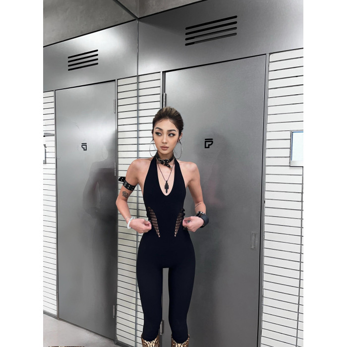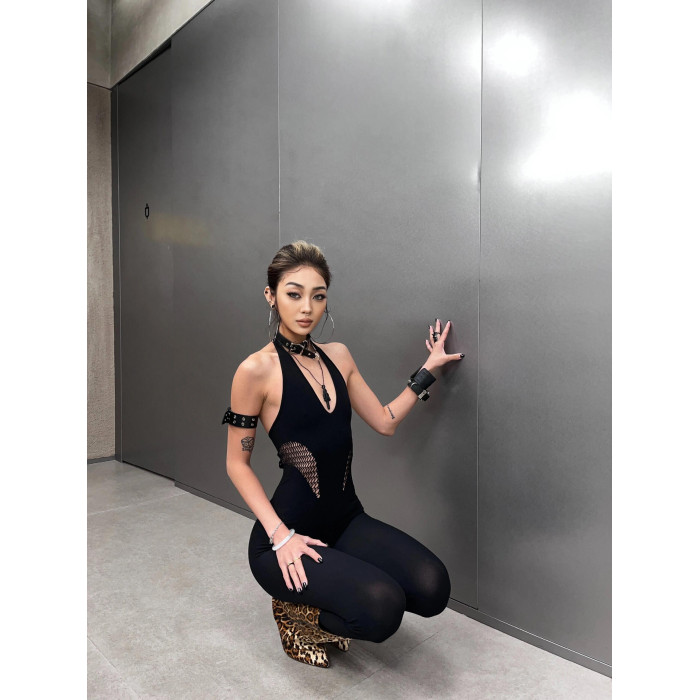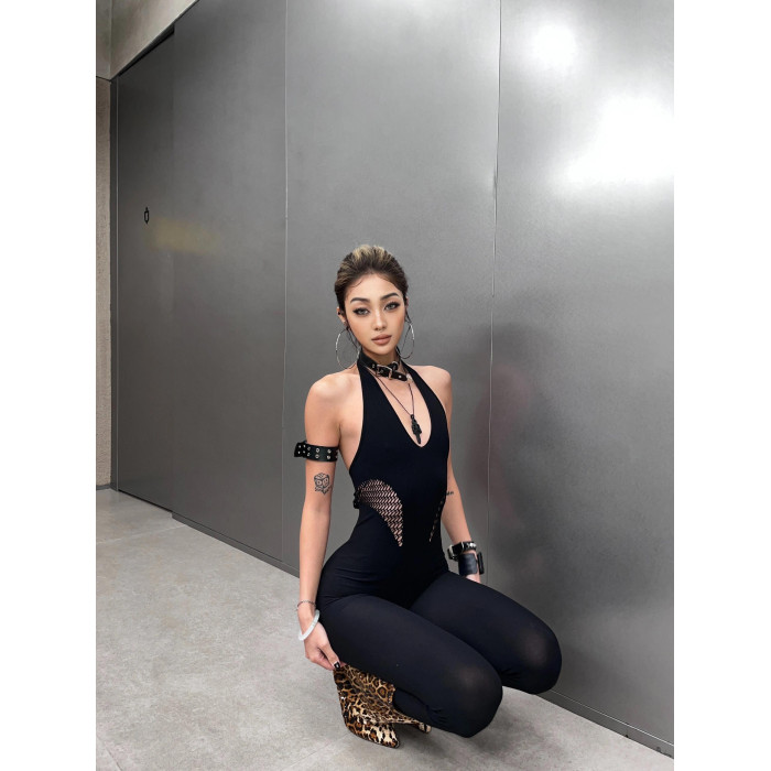 Do vis 歐美辣妹風黑色掛脖連體衣女性感鏤空緊身連體褲