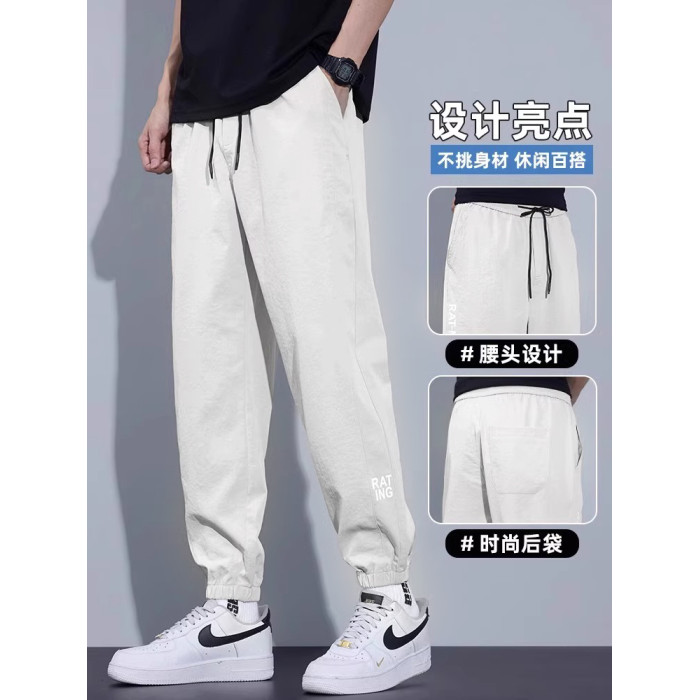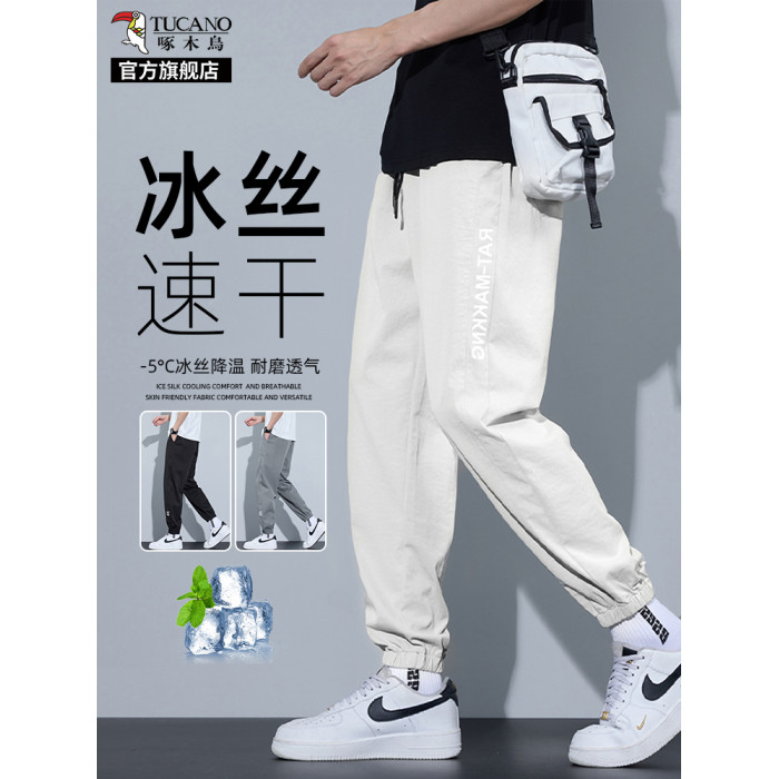 啄木鳥冰絲休閒褲男夏季薄款2025新款速乾寬松束腳運動工裝褲子K