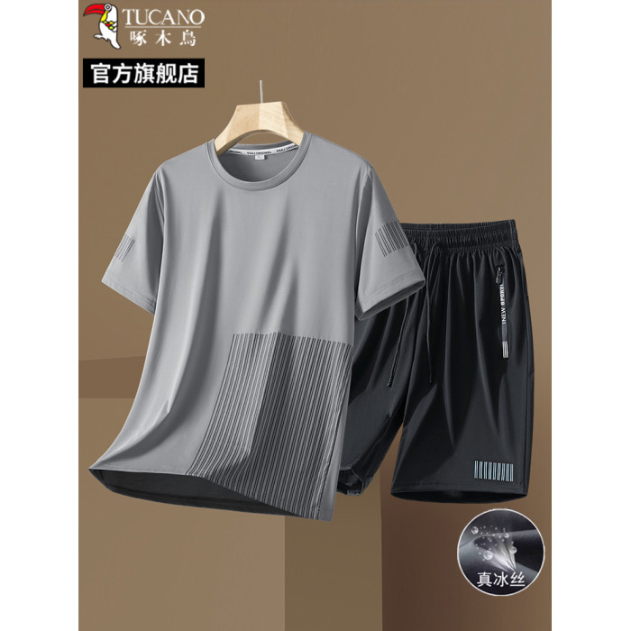 啄木鳥冰絲運動套裝男士夏季2025新款短袖t恤五分短褲休閒兩件套L