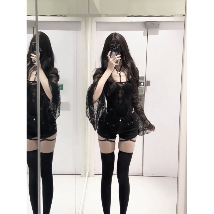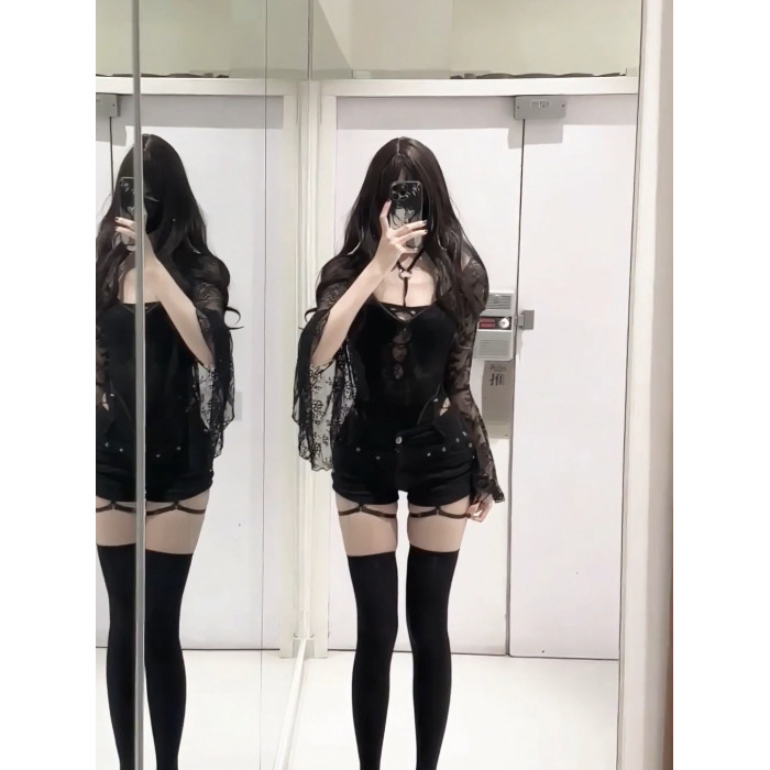 辣妹性感黑色喇叭袖蕾絲連體衣夏季純欲風顯身材包臀短褲兩件套女