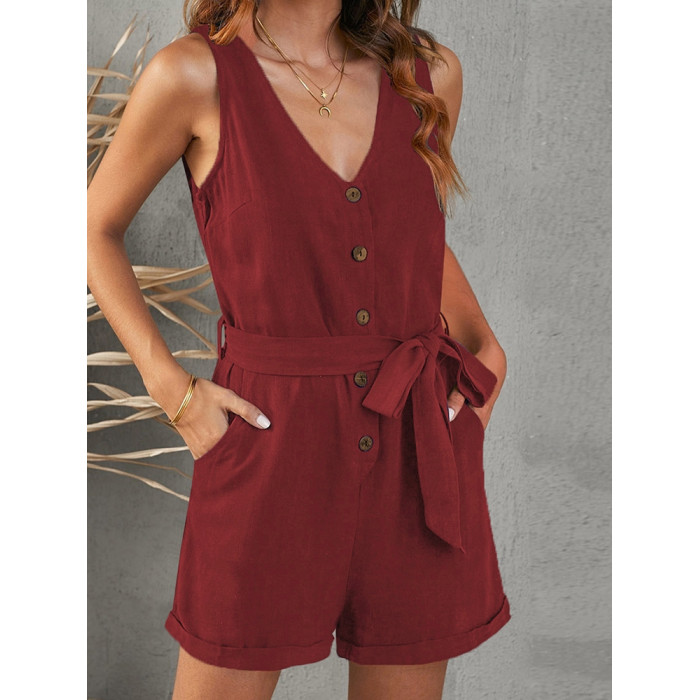 2025夏季V領無袖連體衣女歐美新款單排釦高腰綁帶休閒背心連衣褲