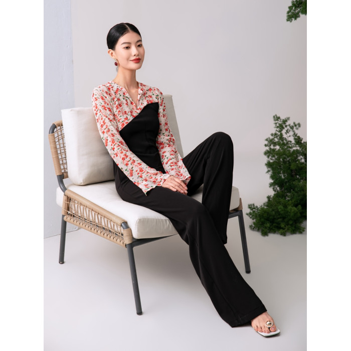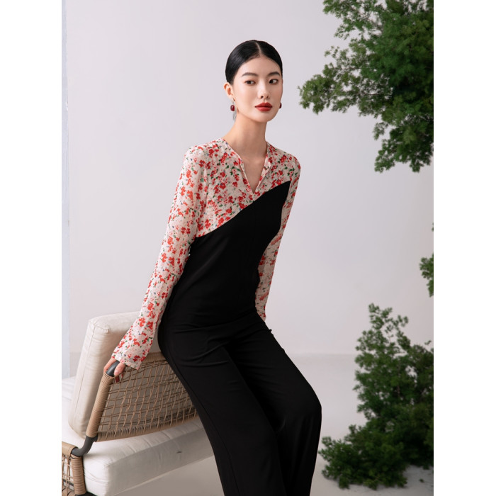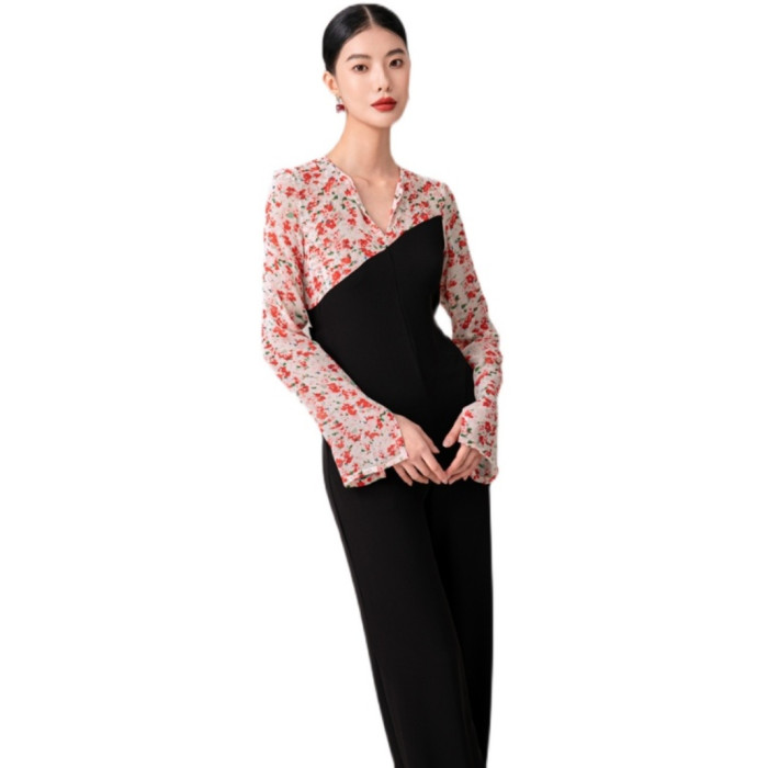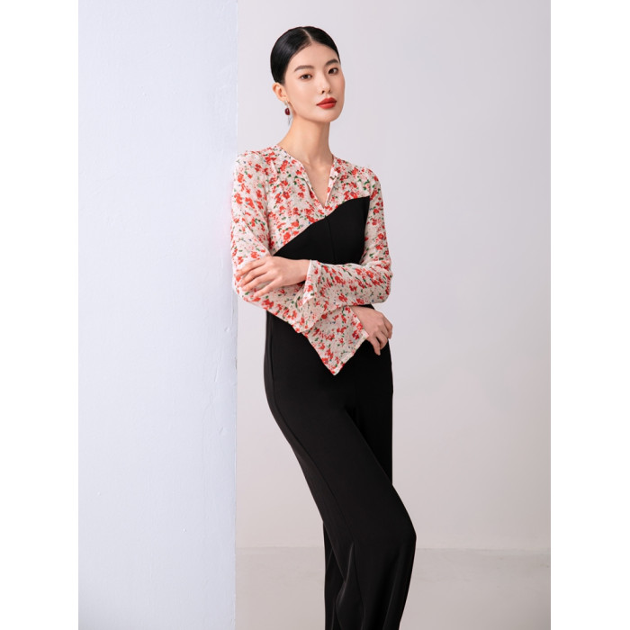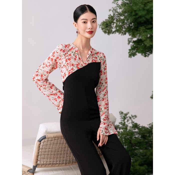 2025春夏新款高級感時尚修身設計濶腿褲連體衣碎花拼接長袖直筒褲