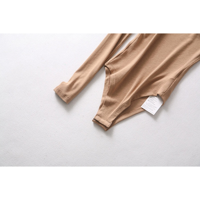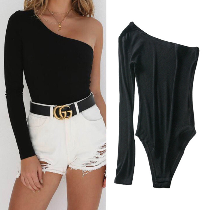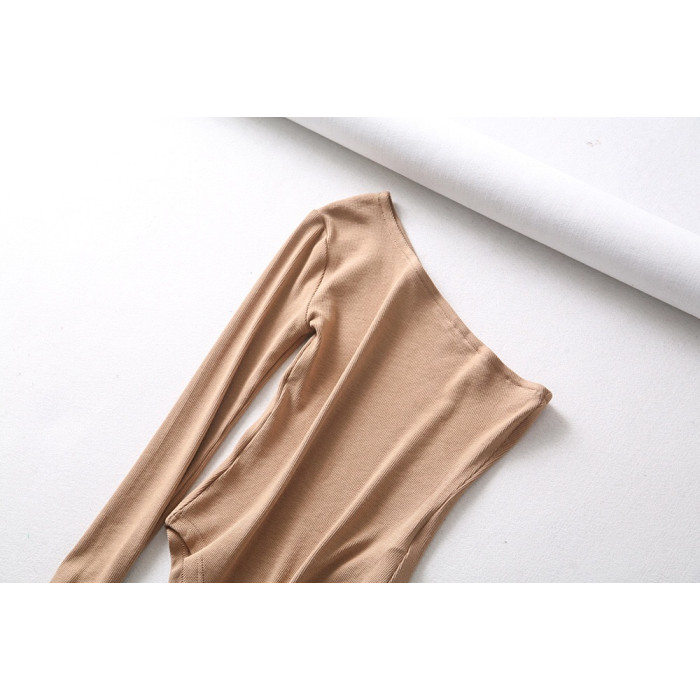 性感顯瘦長袖露單肩上衣2023新款斜肩連體衣露鎖骨心機t恤打底衫