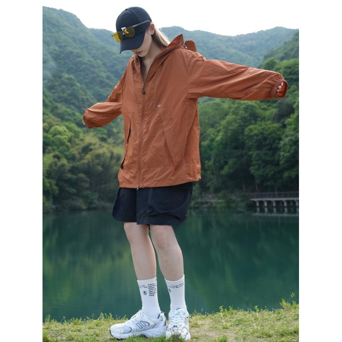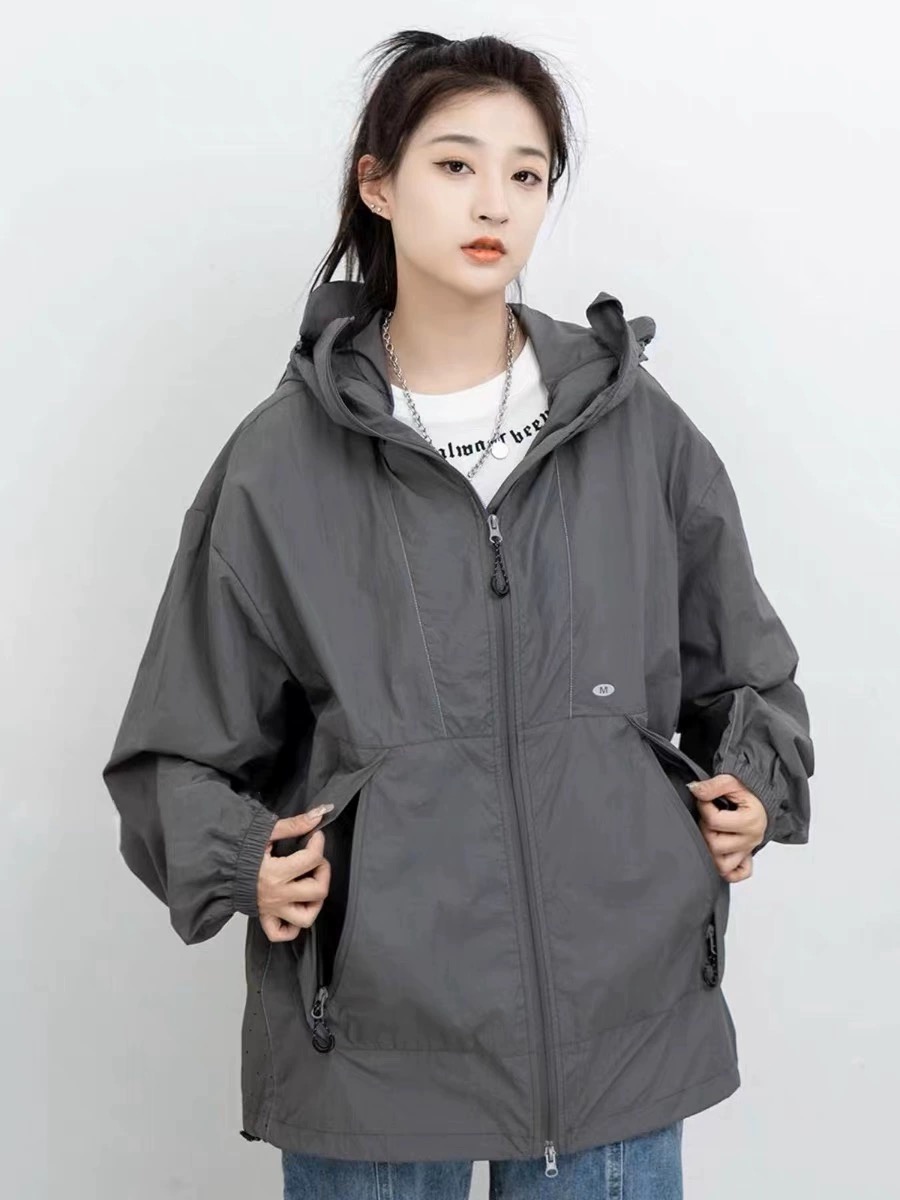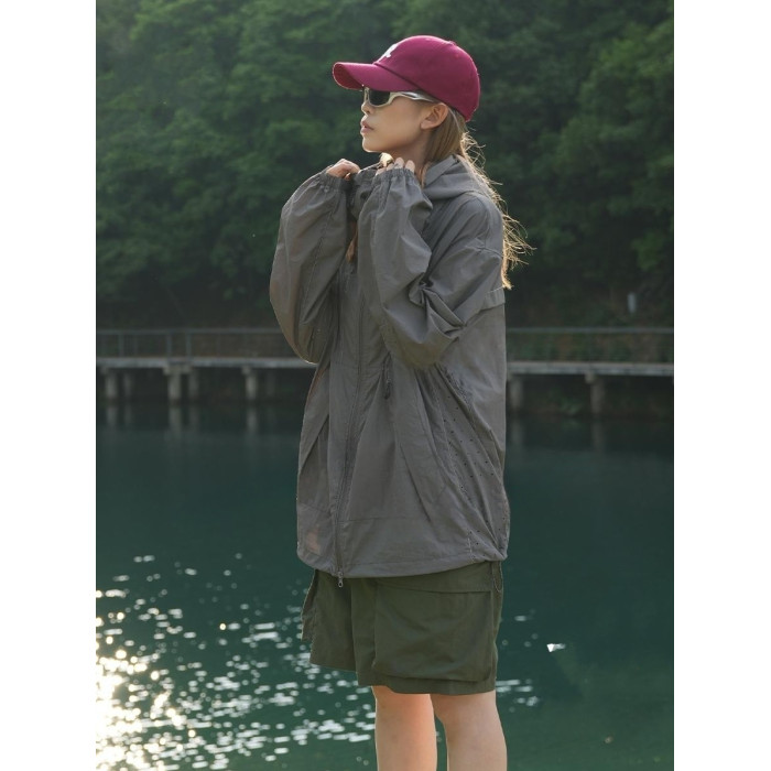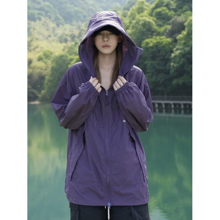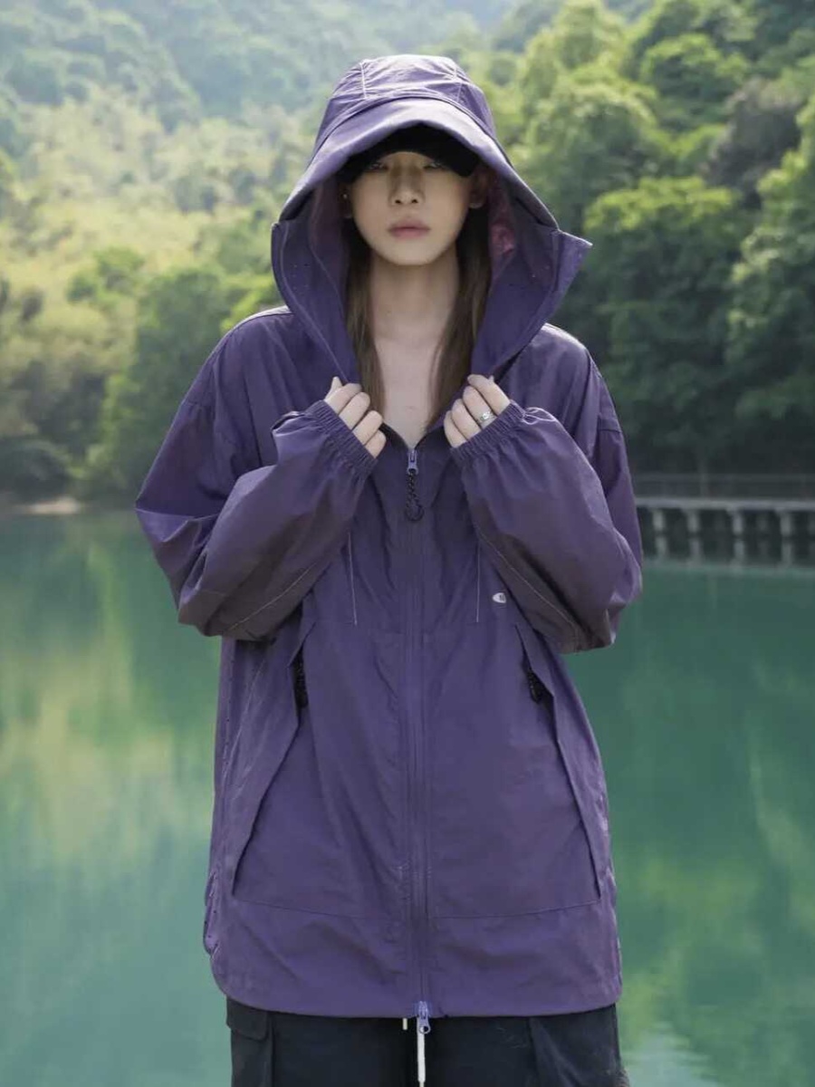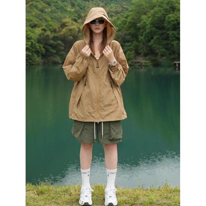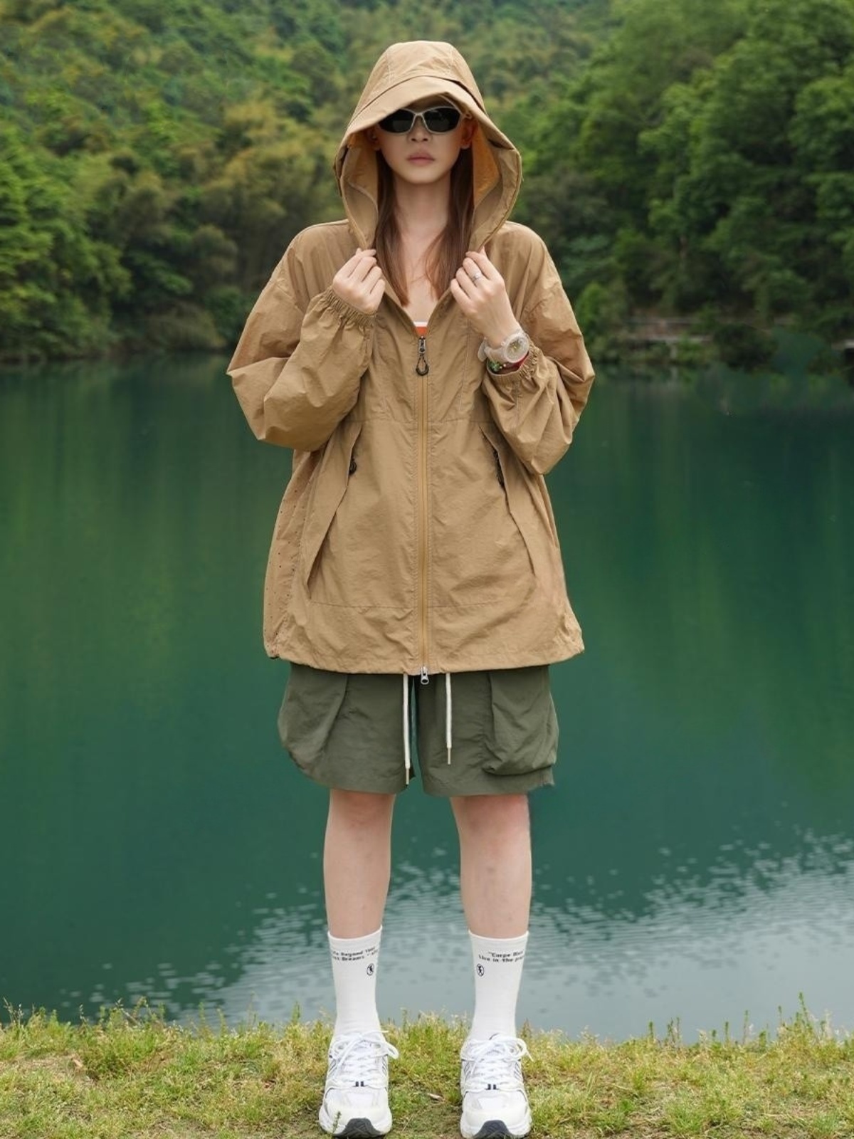 防紫外線連帽簷防曬衣女夏季輕薄透氣寬松山系戶外工裝沖鋒衣外套