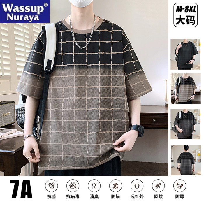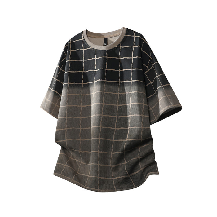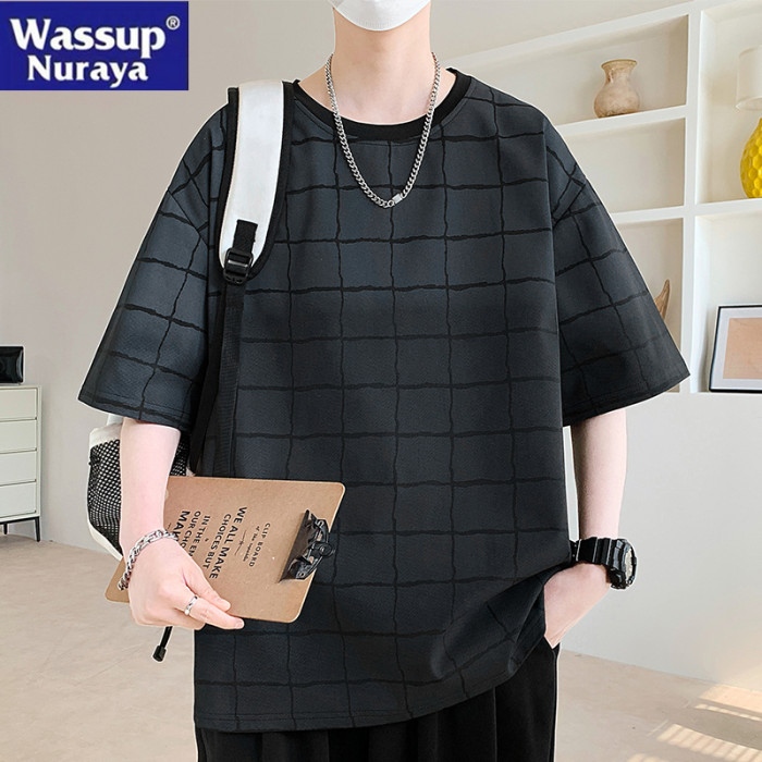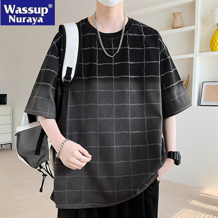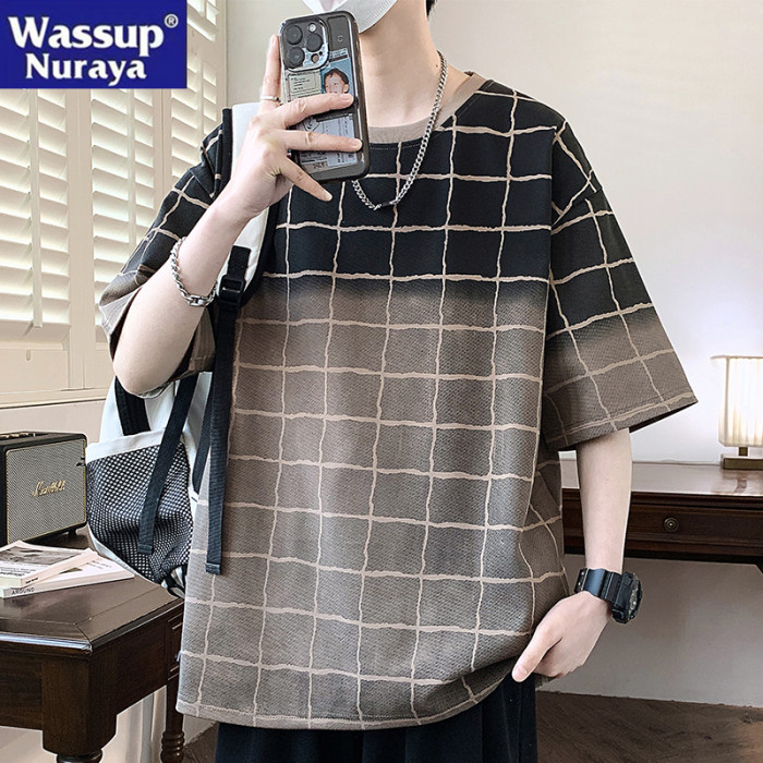 WASSUP NURAYA短袖t恤男夏季格子漸變圓領體恤衫寬松休閒青年上衣