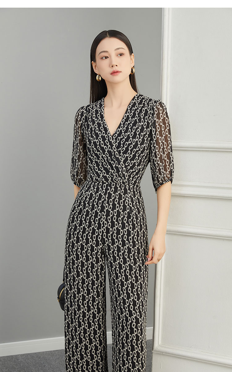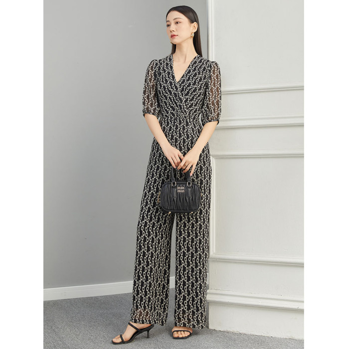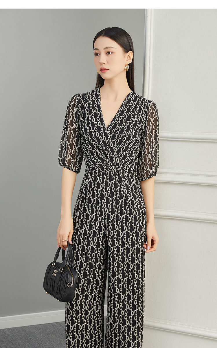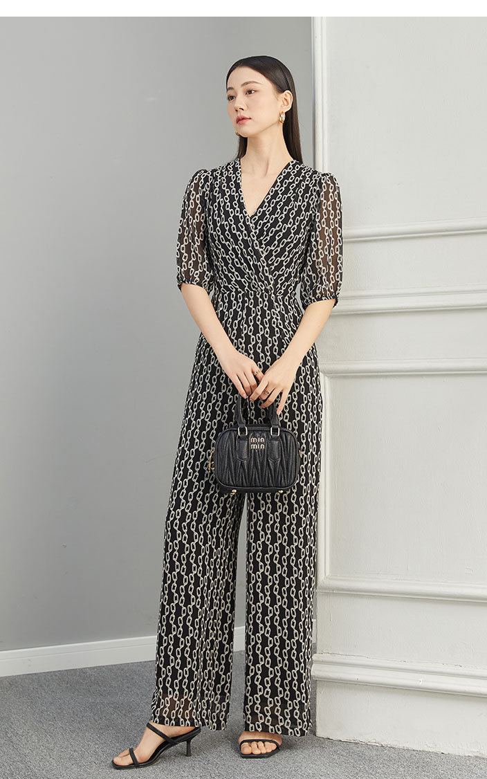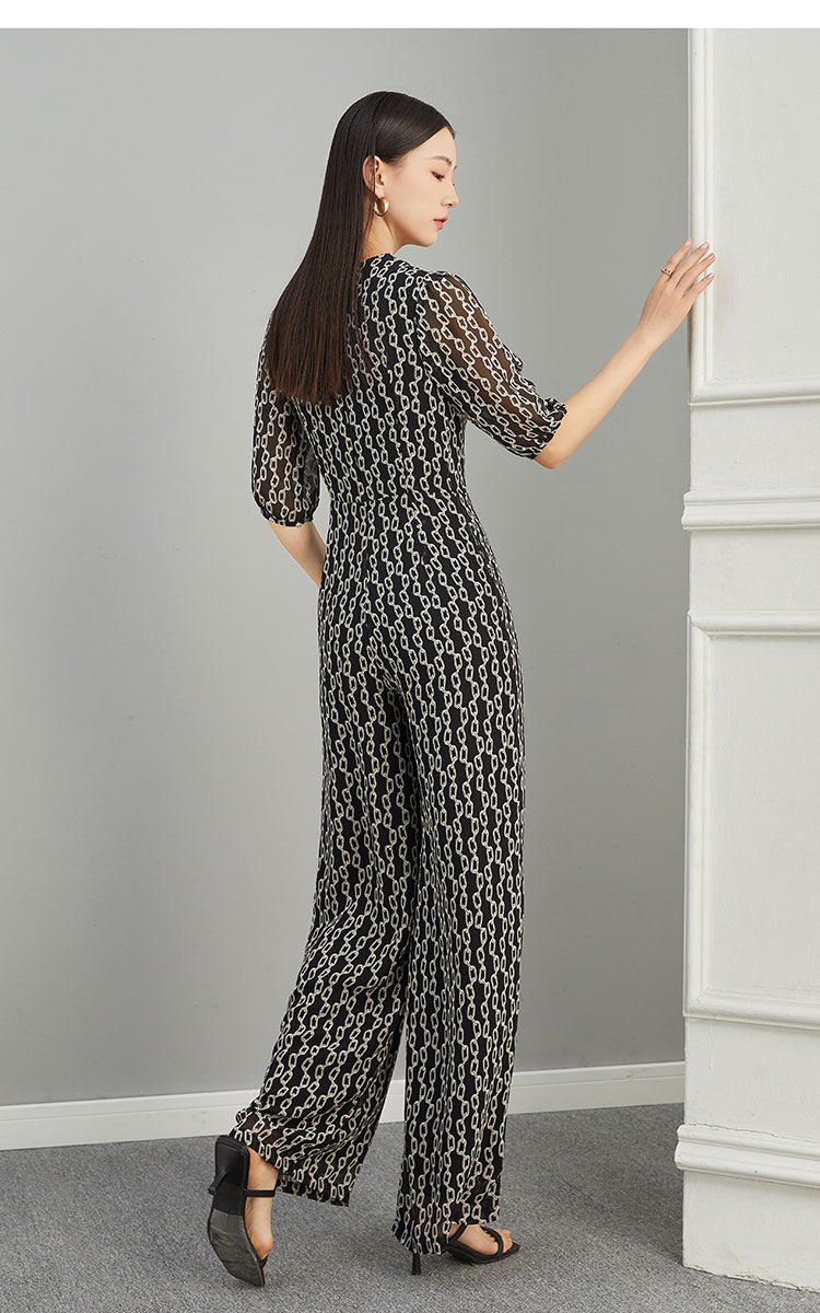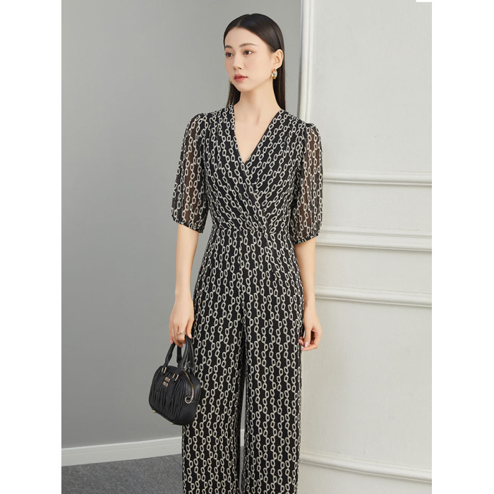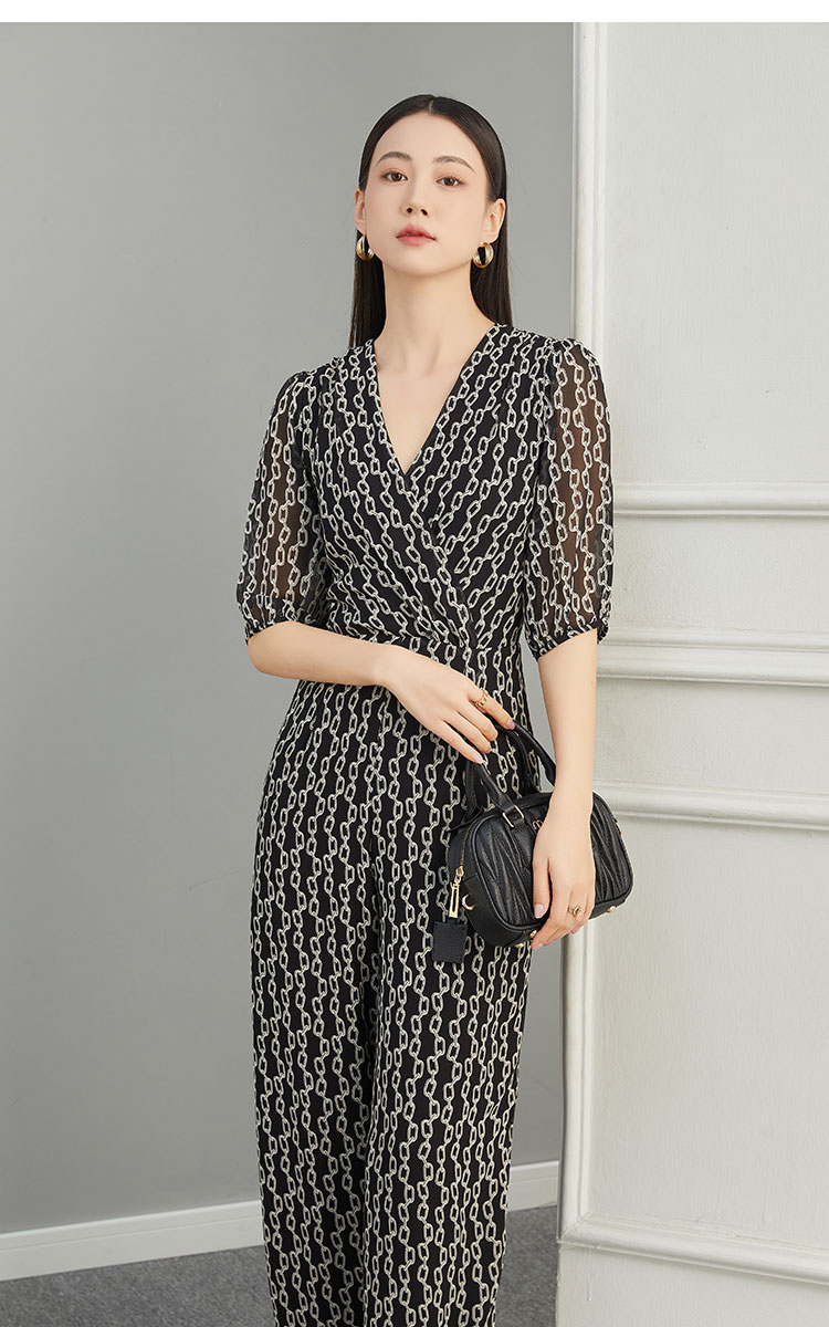 2025夏新款女式喬其雪紡印花高腰修身顯瘦連體長褲優雅連體衣