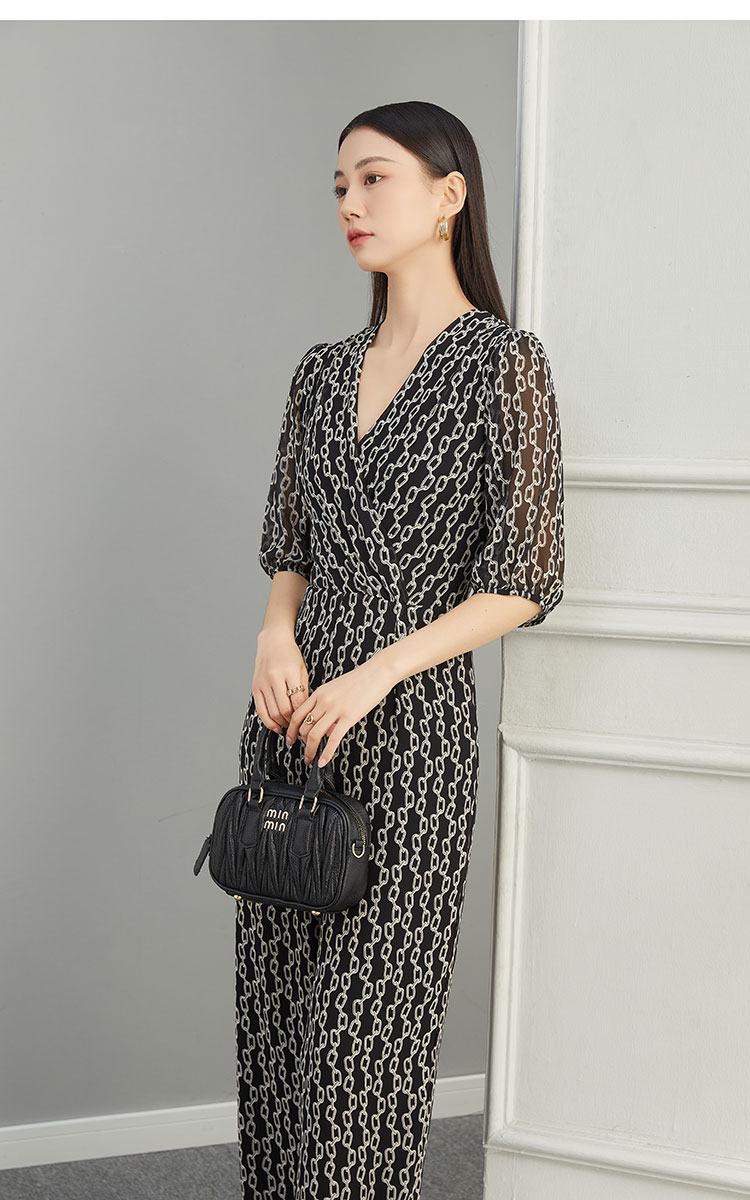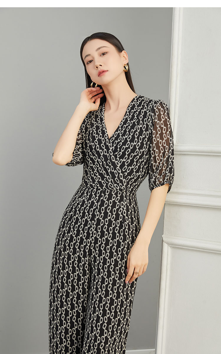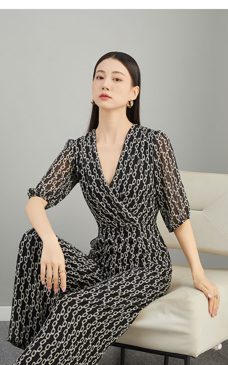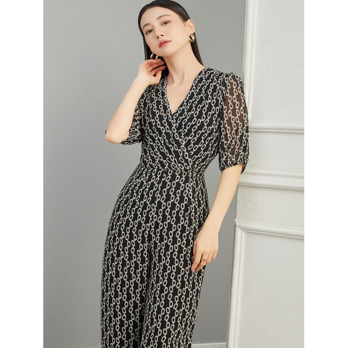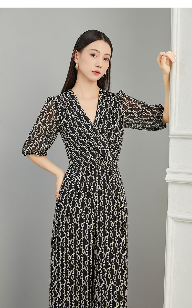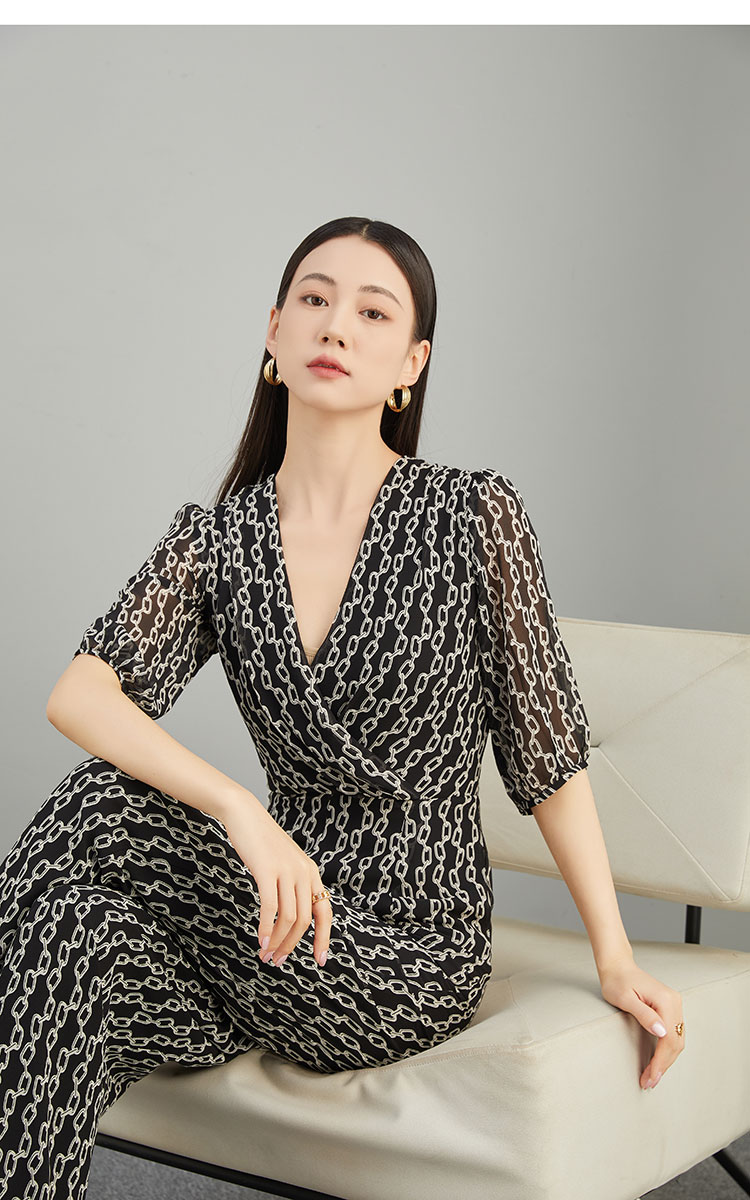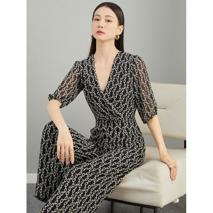 2025夏新款女式喬其雪紡印花高腰修身顯瘦連體長褲優雅連體衣