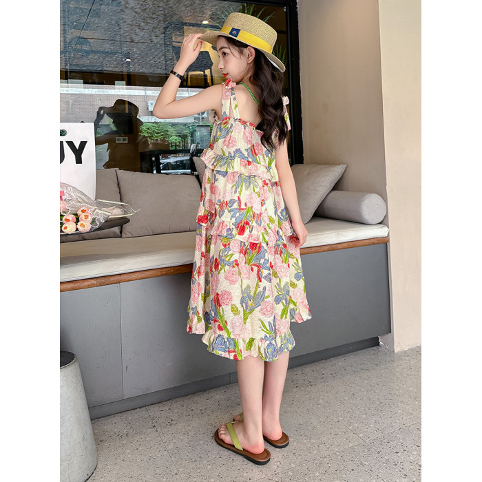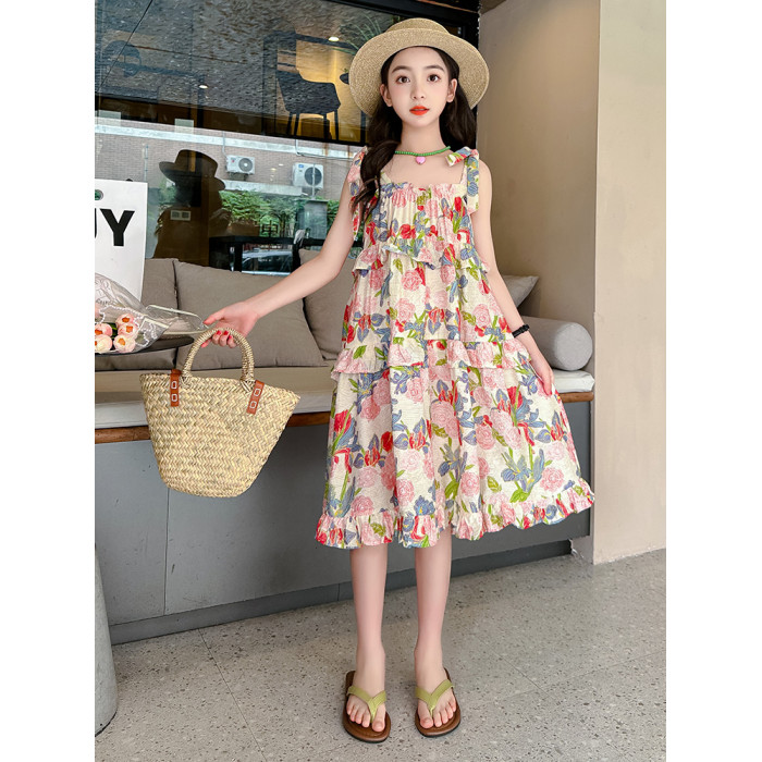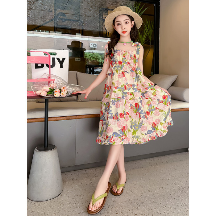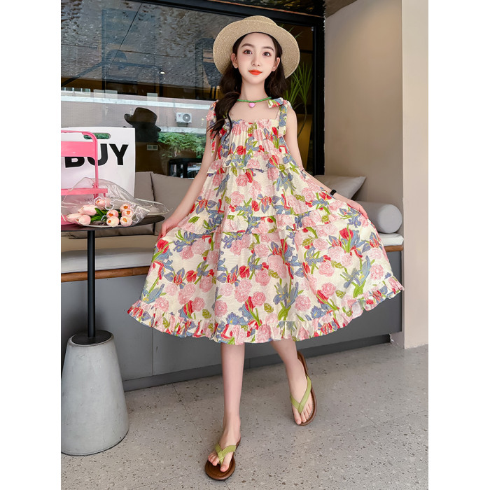 女童吊帶裙夏季2025新款洋氣兒童度假碎花沙灘裙女大童夏裝連衣裙