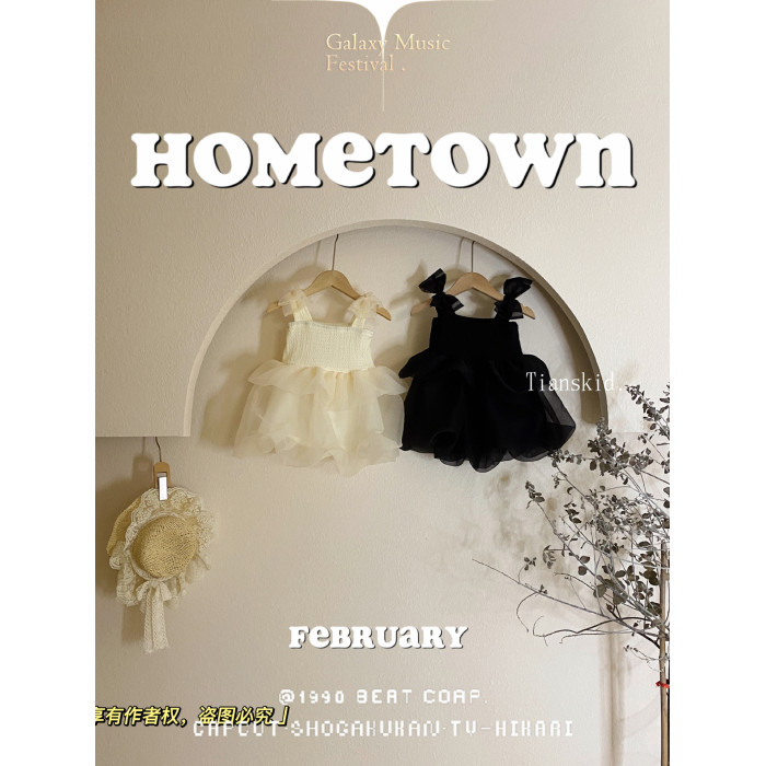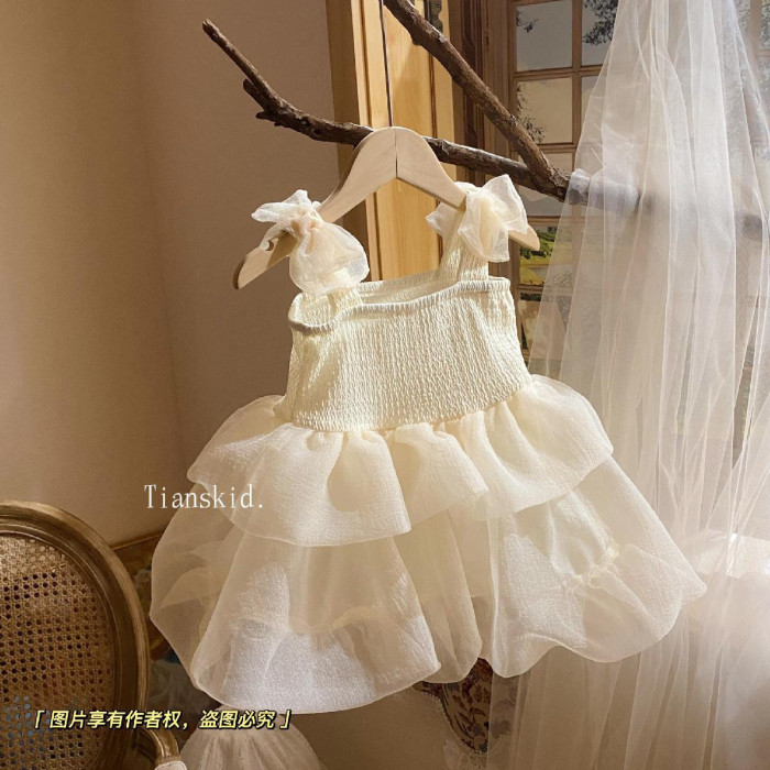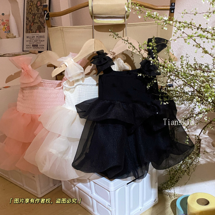 泡泡家 2024韓國童裝洋氣女童氣質蝴蝶結吊帶裙網紗裙蓬蓬蛋糕裙
