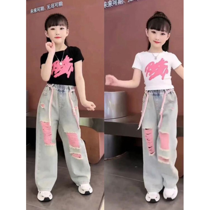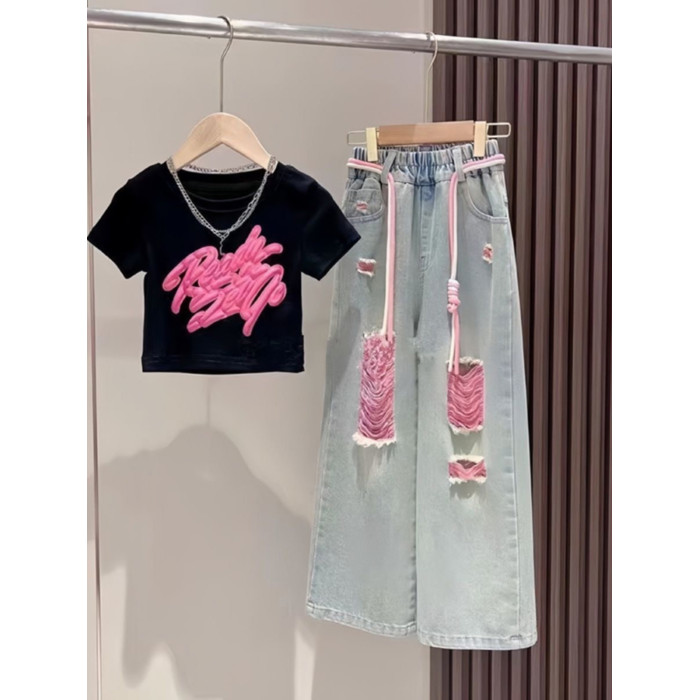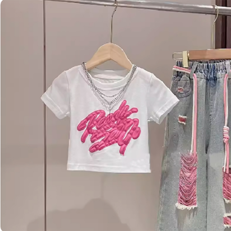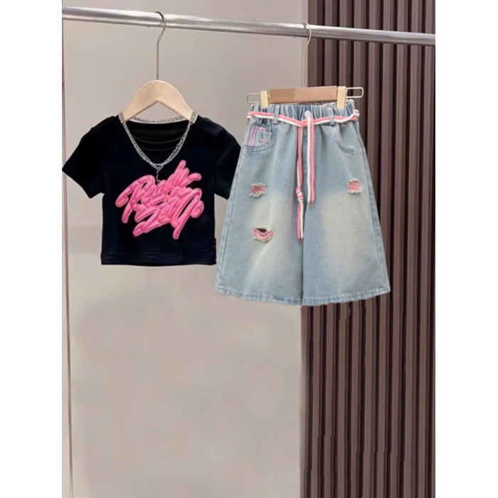 法國女童短袖t恤夏裝套裝兒童女孩上衣短款黑色大童體恤半袖夏季