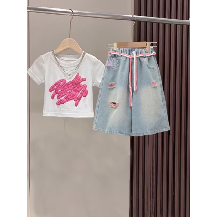 白色上衣+牛仔五分褲