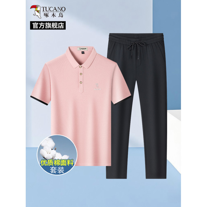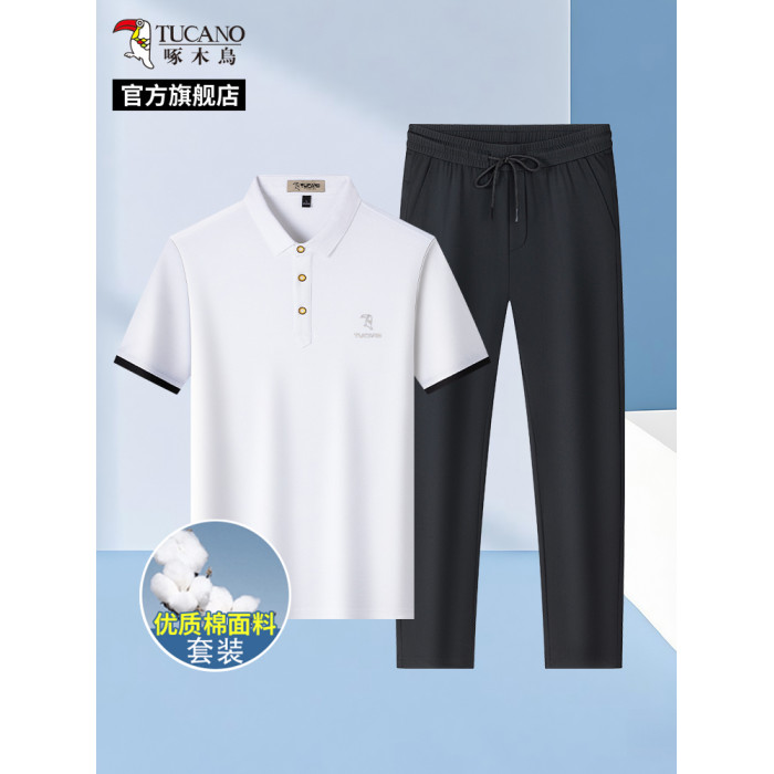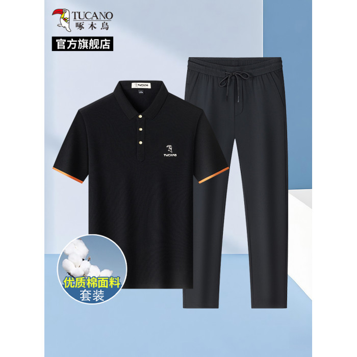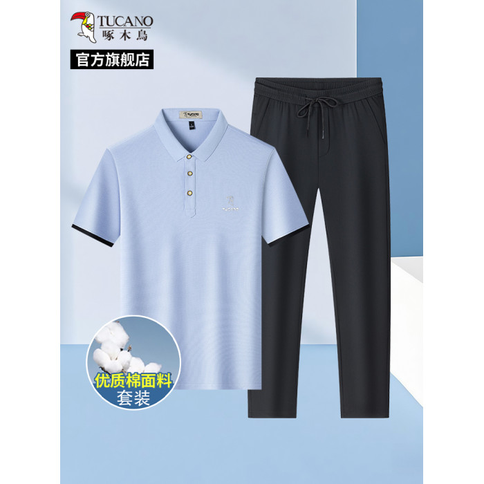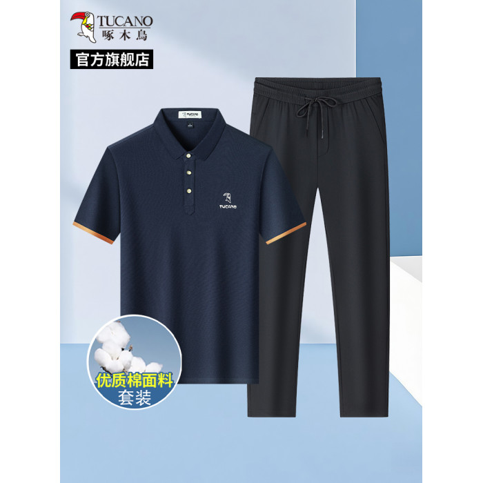 啄木鳥7A抗菌100%純棉短袖POLO衫+夏季冰絲休閒褲子男士T恤套裝H