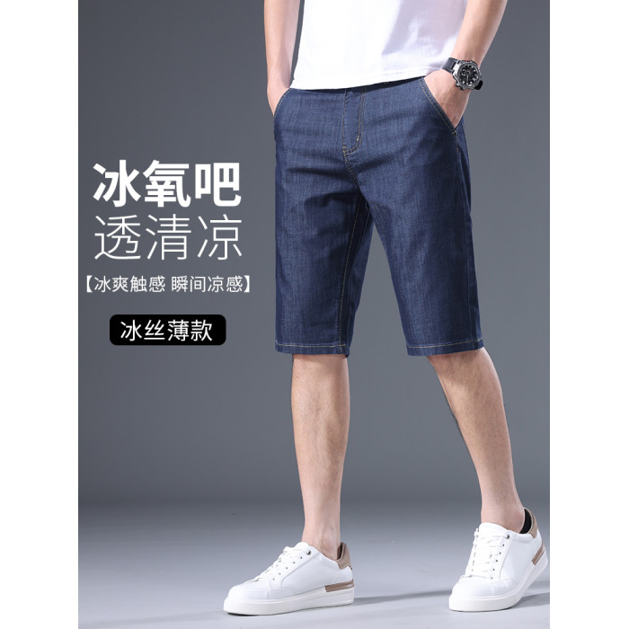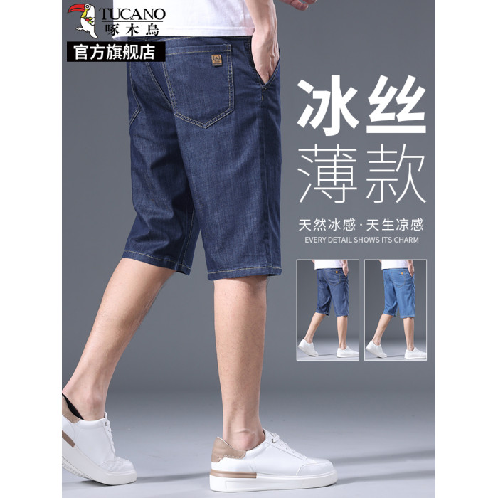 啄木鳥冰絲牛仔短褲男士夏季薄款寬松直筒七分褲爸爸天絲五分褲K