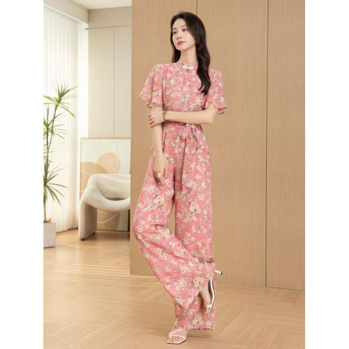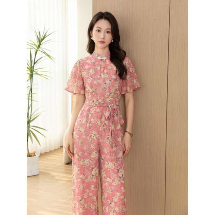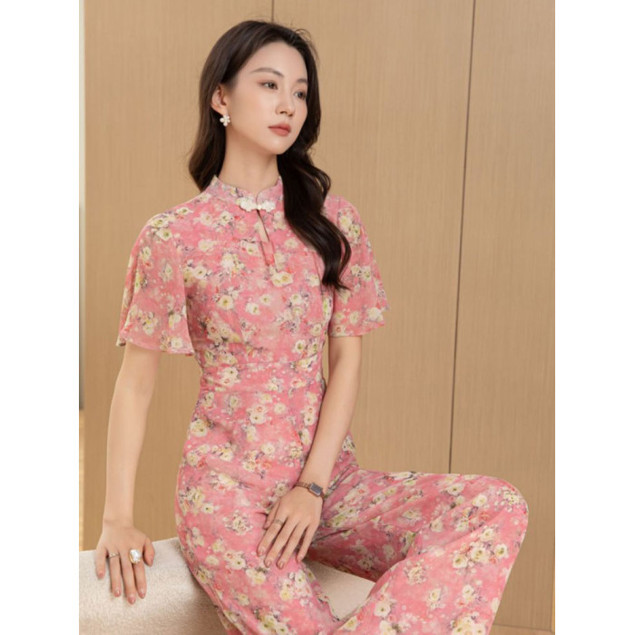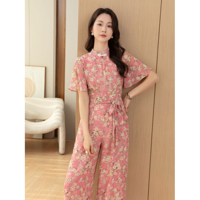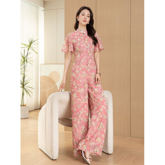 風旗袍改良立領原創夏新款女高腰修身顯瘦連體長褲優雅連體衣