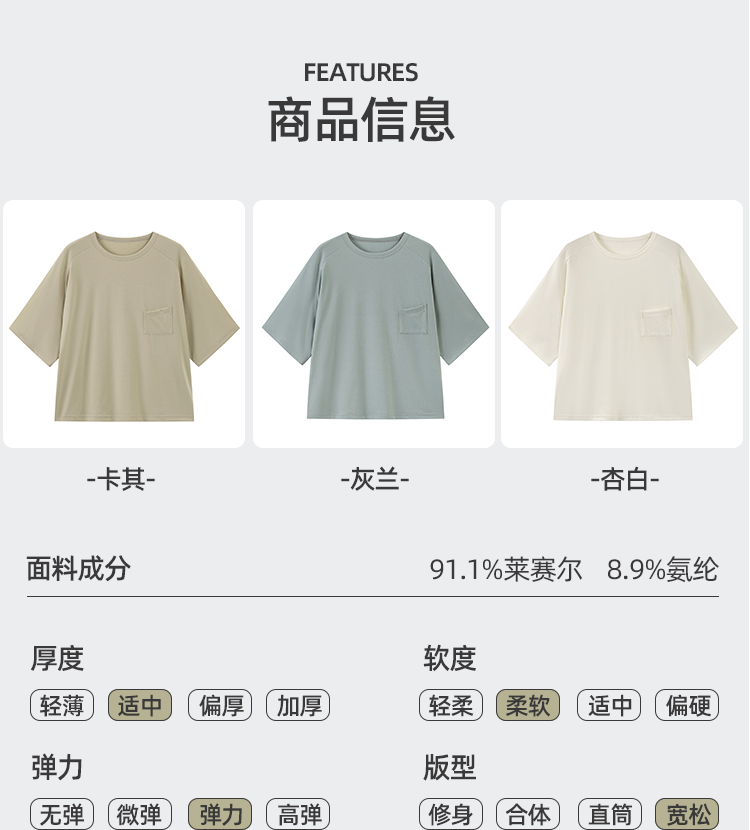 萊賽爾纖維(萊賽爾)91.1% 聚氨酯彈性纖維(氨綸)8.9%