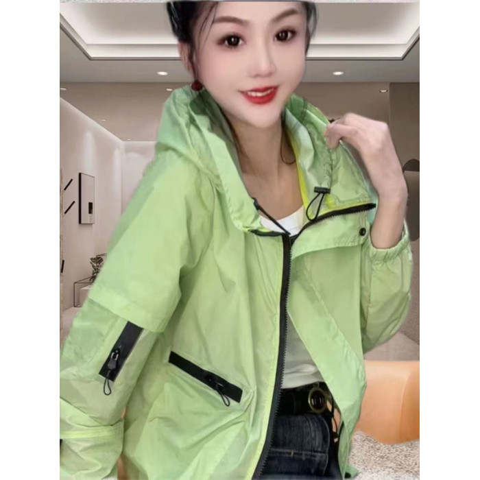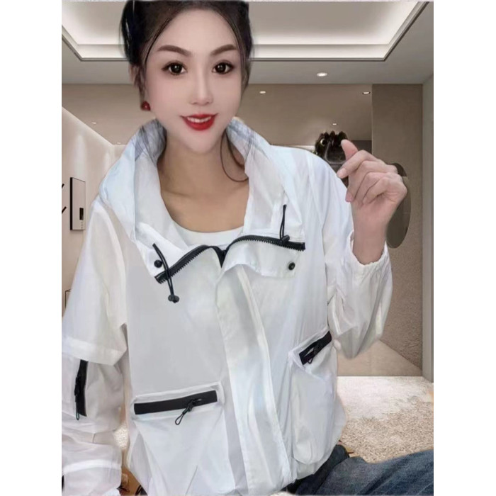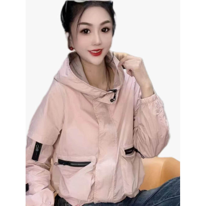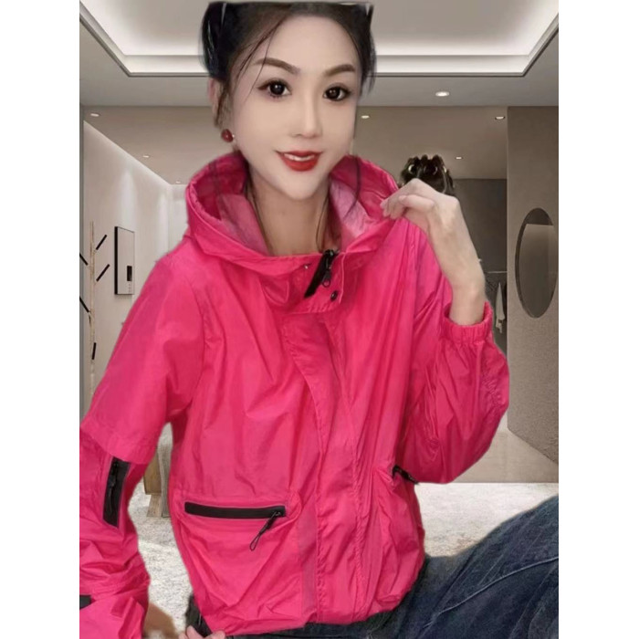 高級休閒防曬衣女長袖連帽純色雙兜拉鍊時尚百搭洋氣防曬外套