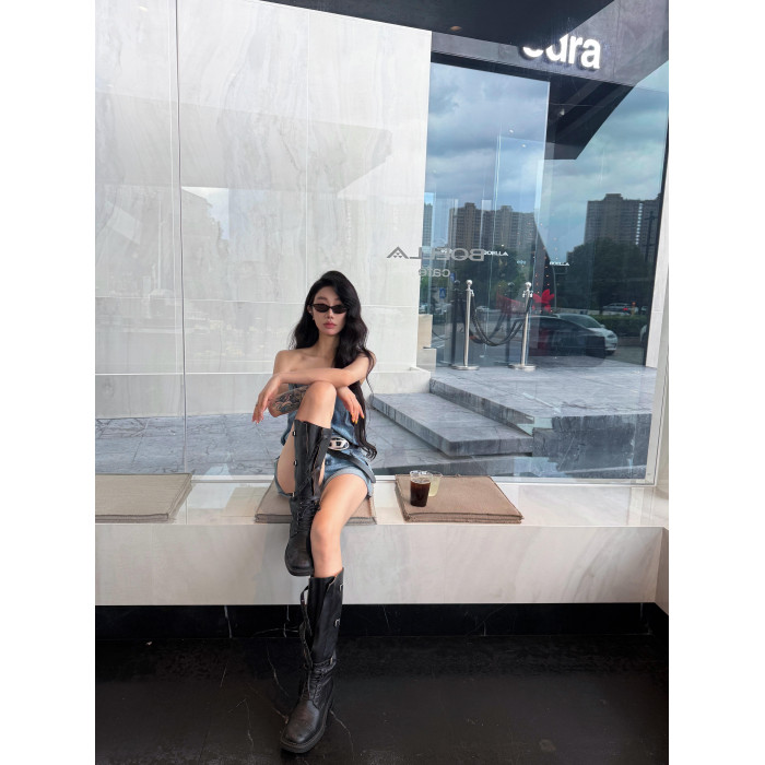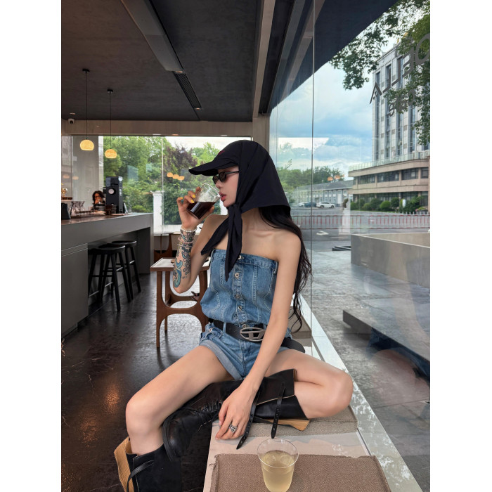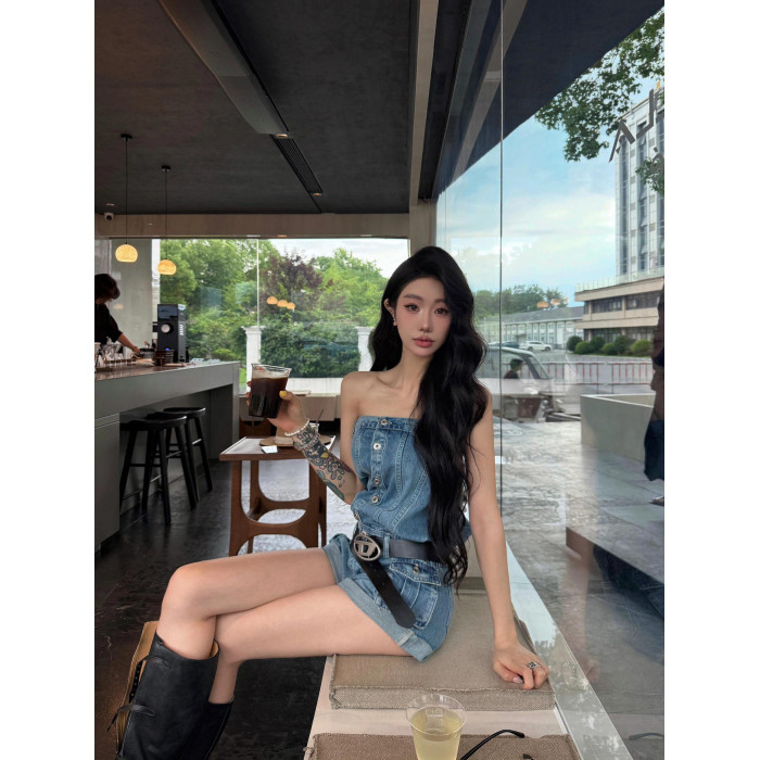 歐美辣妹風藍色牛仔抹胸連體衣女夏季新款設計感連體褲連身短褲