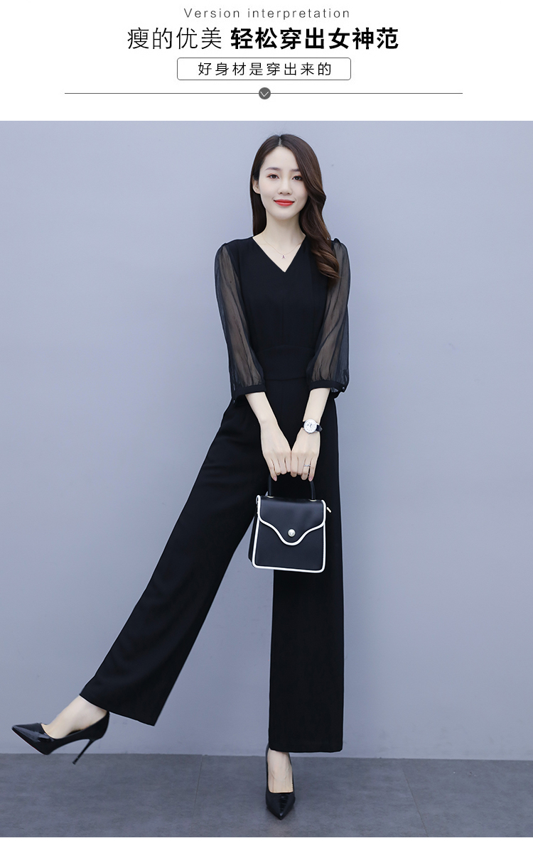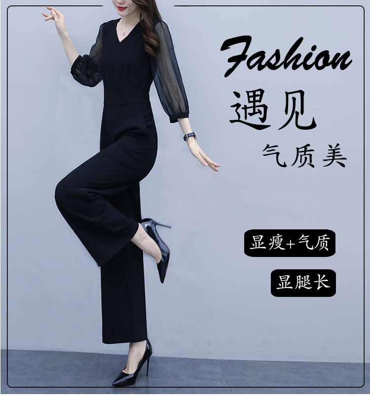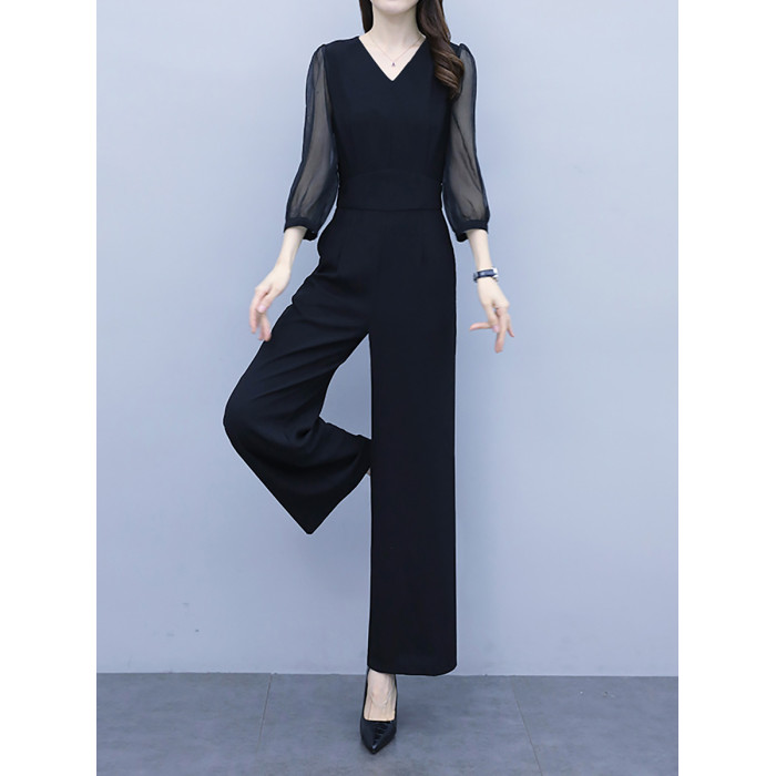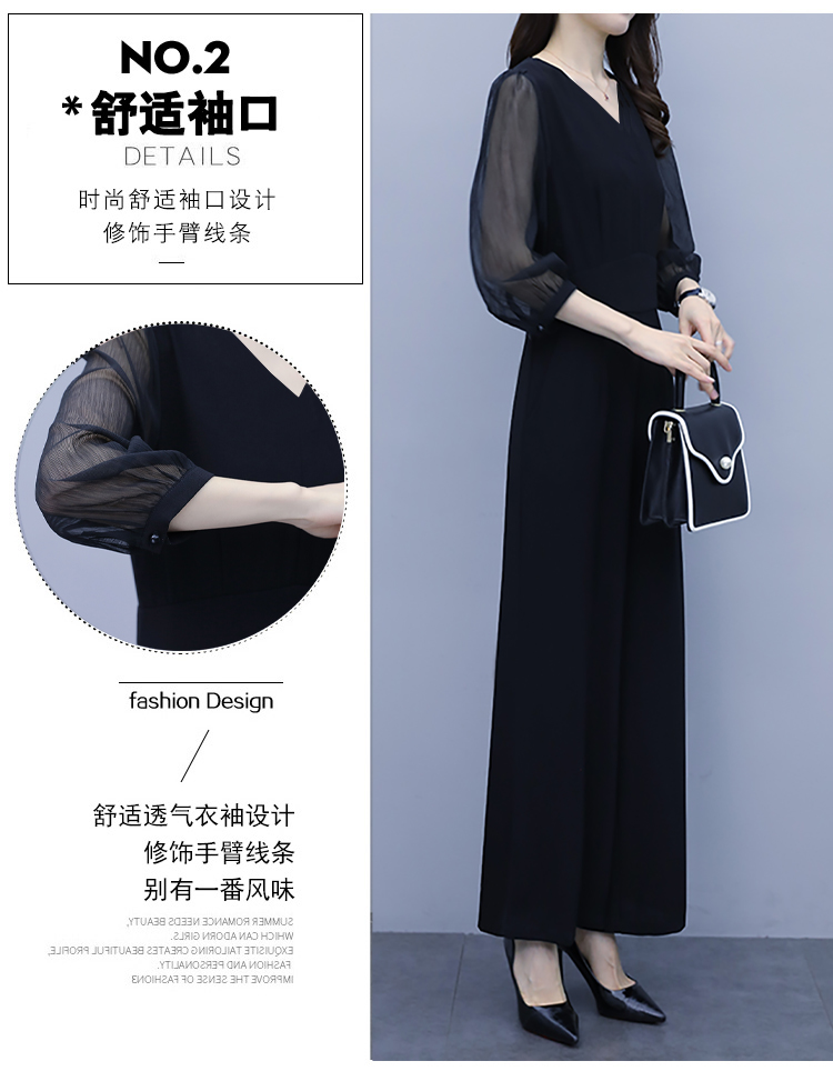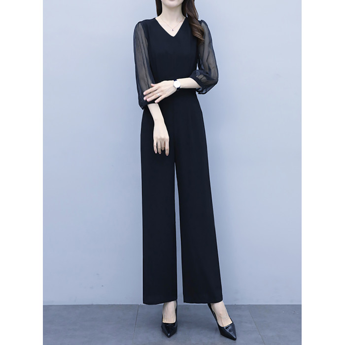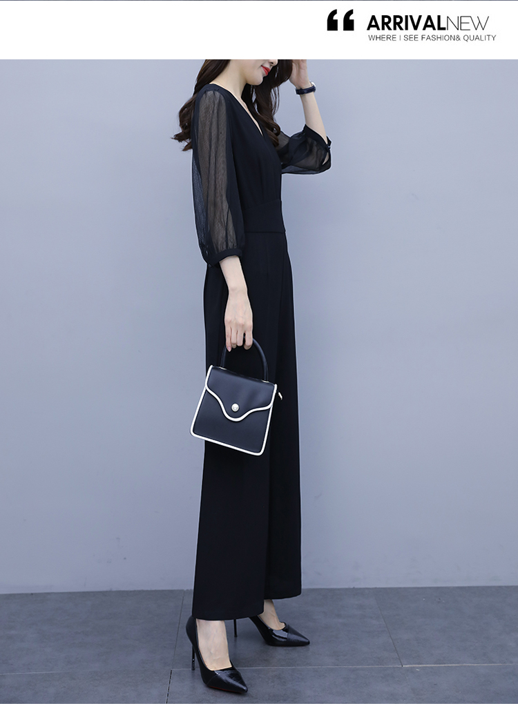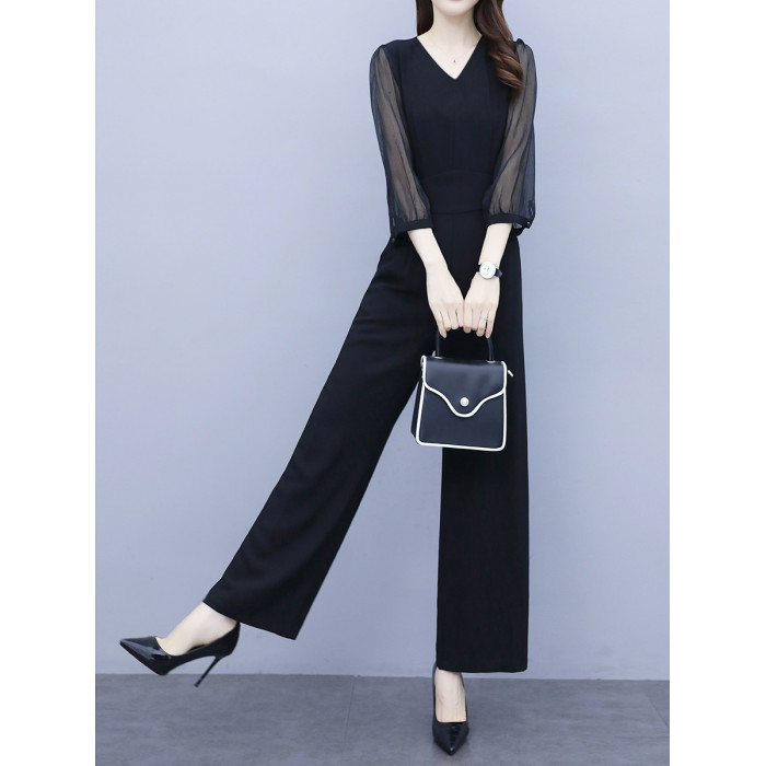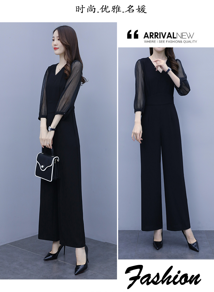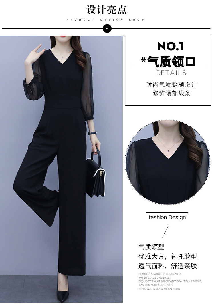 2025新款時尚工裝濶腿連體褲夏季黑色氣質薄款雪紡連體衣套裝女裝