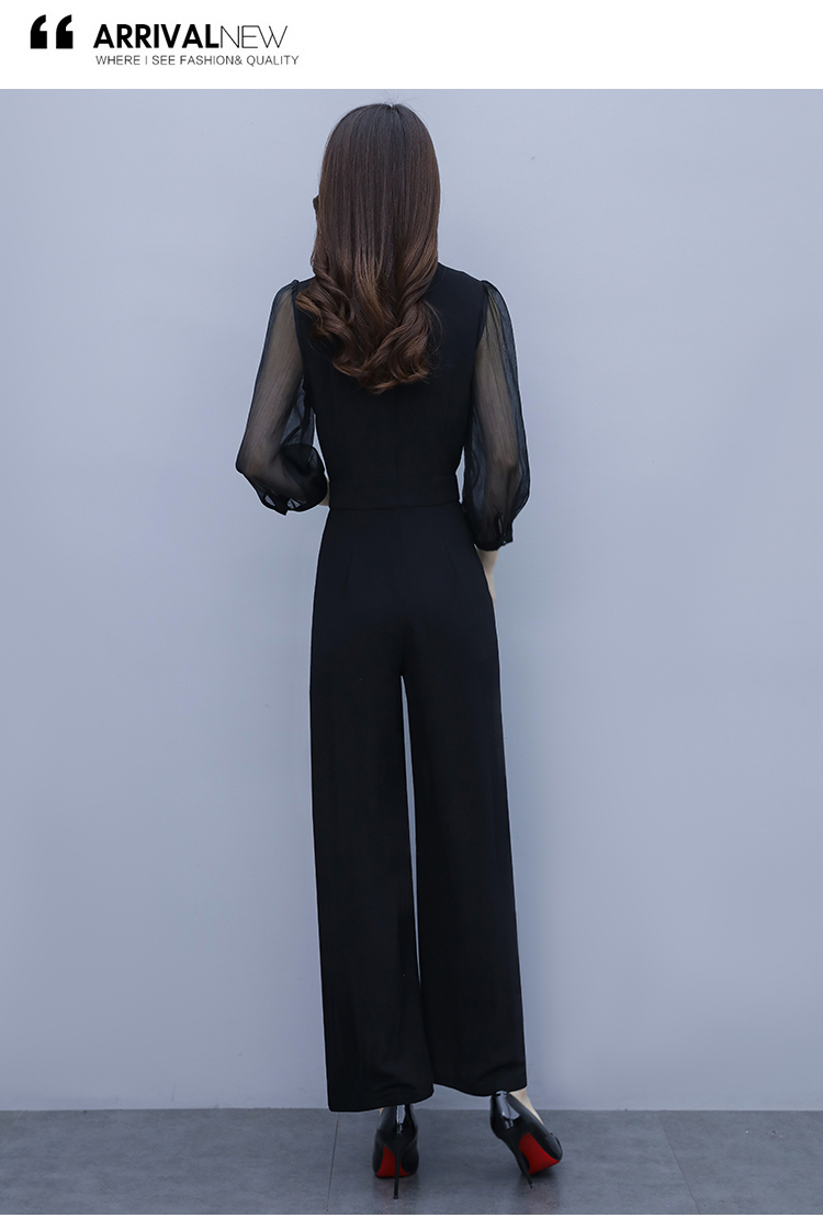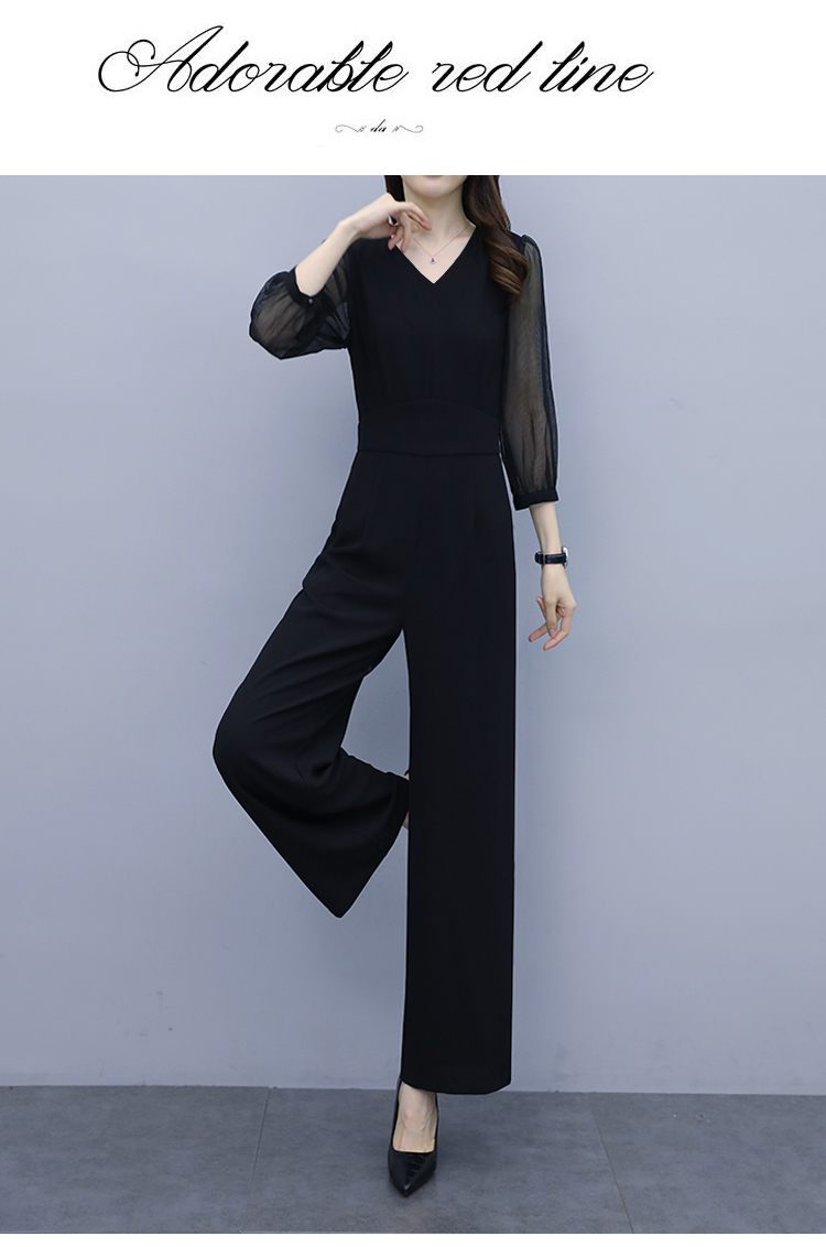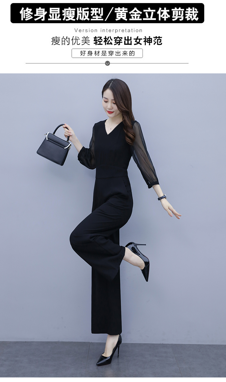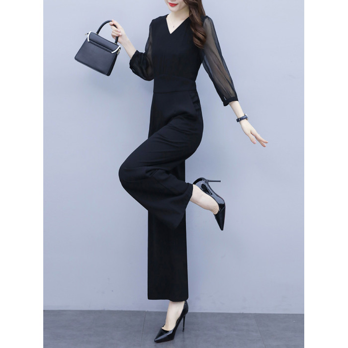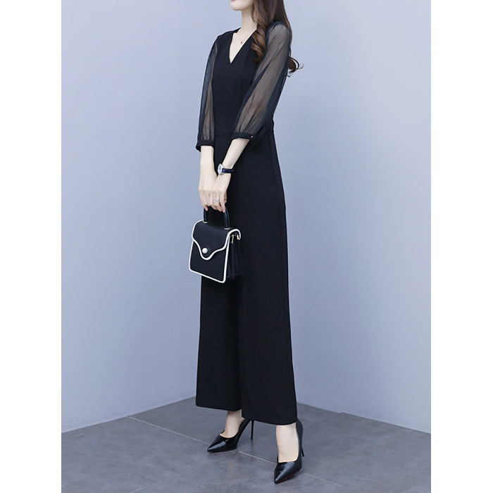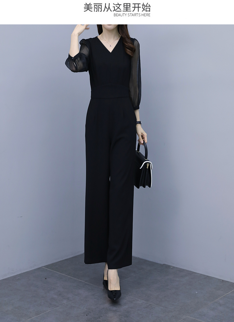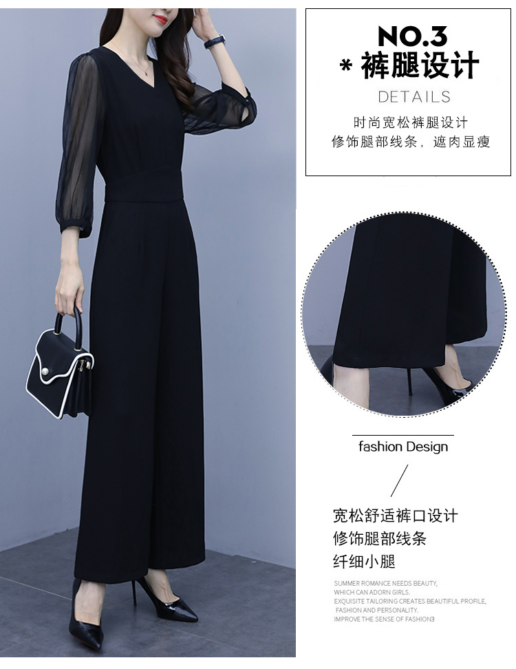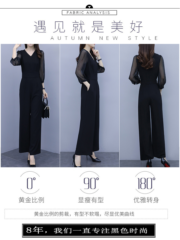 2025新款時尚工裝濶腿連體褲夏季黑色氣質薄款雪紡連體衣套裝女裝