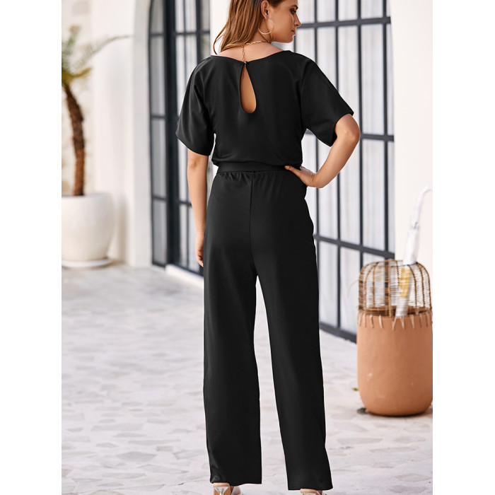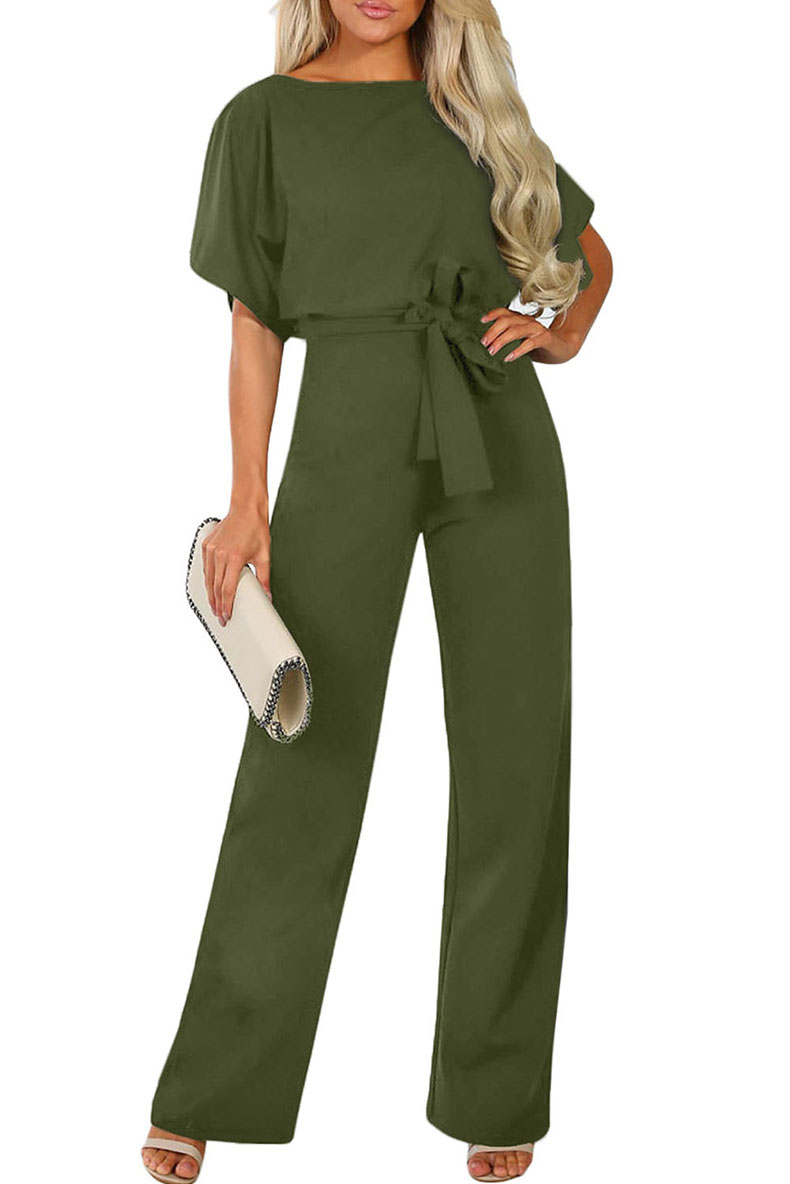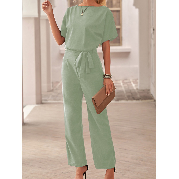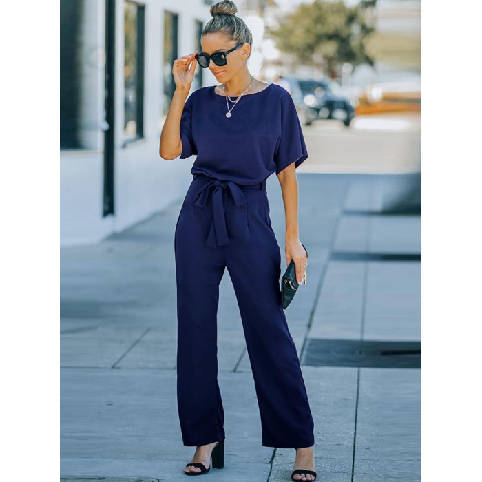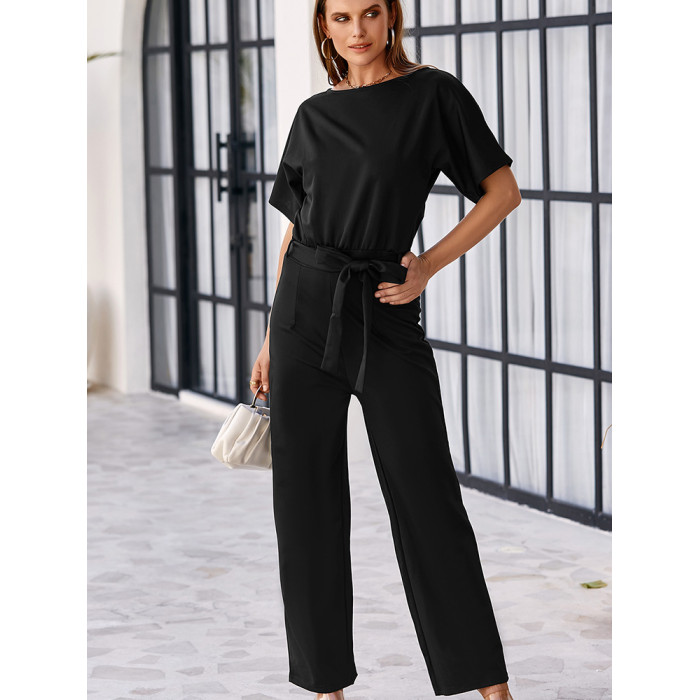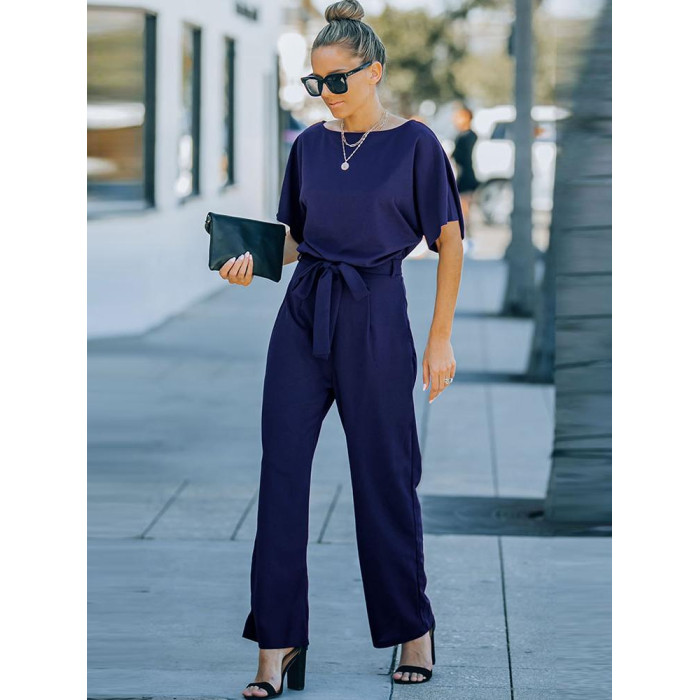 2025夏季薄款純色短袖連體衣女歐美個性系腰帶後背鏤空濶腿連體褲